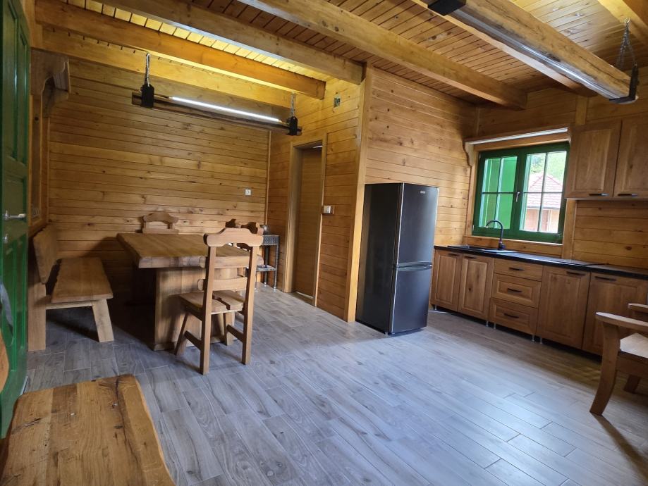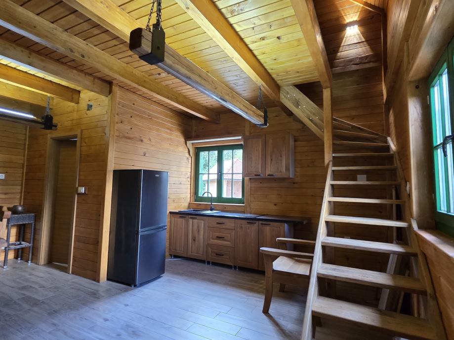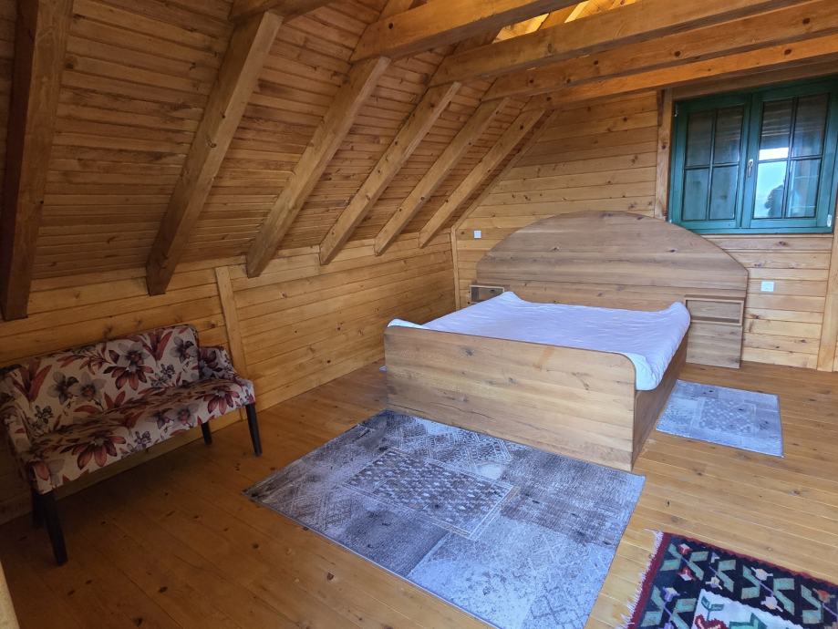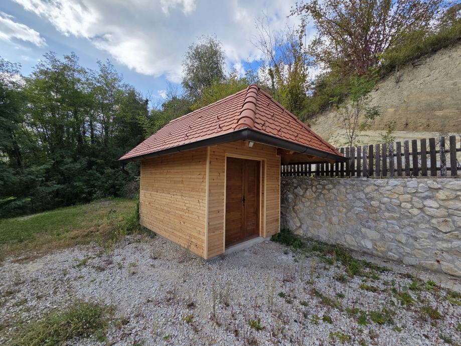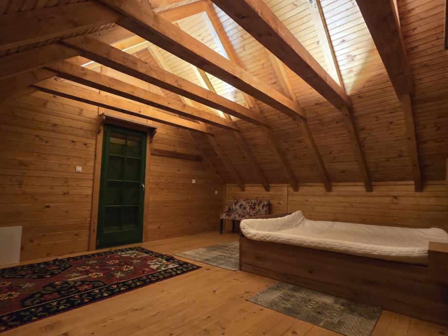 Kuća za odmor,drvena sa pripadajućom ograđenom okućnicom i spremištem.U potkrovlju spavaća soba,u prizemlju kuhinja sa blagovaonom i dnevnim boravkom te kupaonom.Moguća zamjena za nekretninu ili zemljište na moru ili u Istri