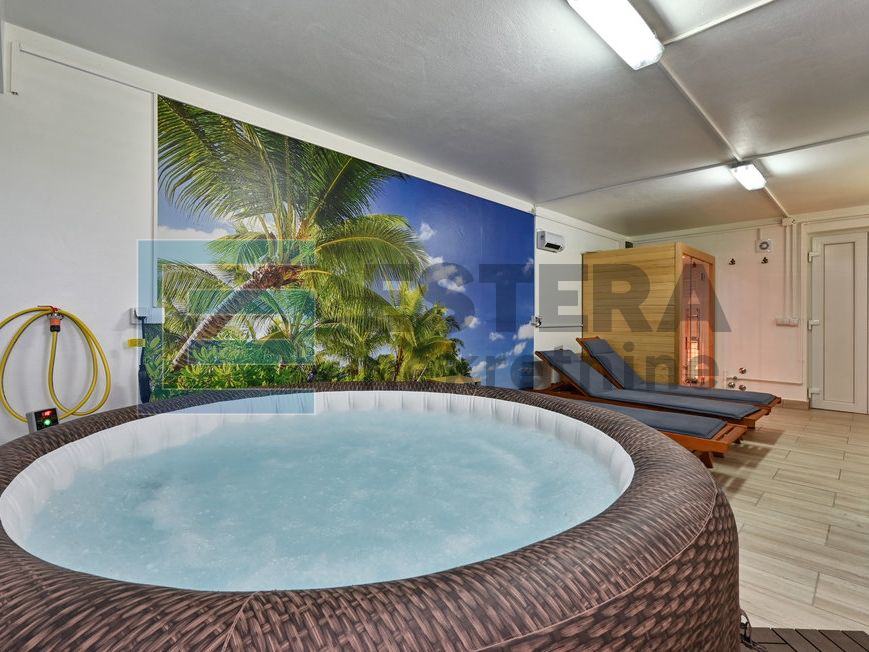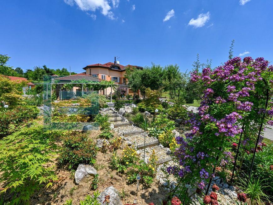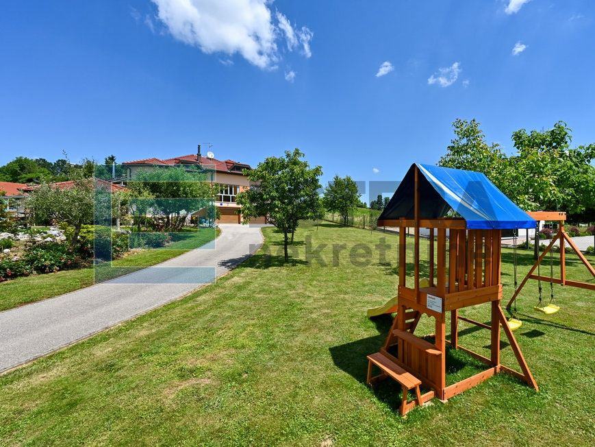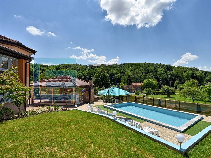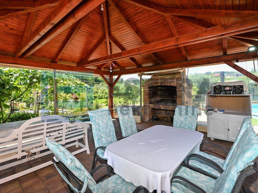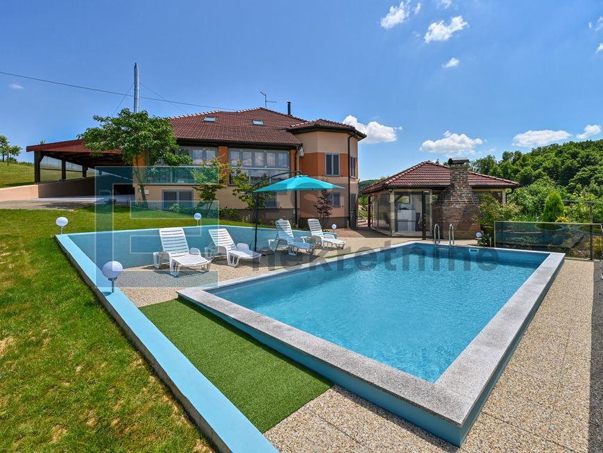 PRODAJE se kuća s bazenom na ekskluzivnoj lokaciji u neposrednoj blizini termalnog kompleksa Sv. Martin na Muri (500 m), površine 300 m2 na parceli od 4000 m2, s vanjskim grijanim bazenom, pomoćnim objektom s dvije garaže, sanitarnim čvorom i tušem, vrtnom sjenicom, ograđenim dječjim igralištem, sigurnim za djecu i kućne ljubimce.