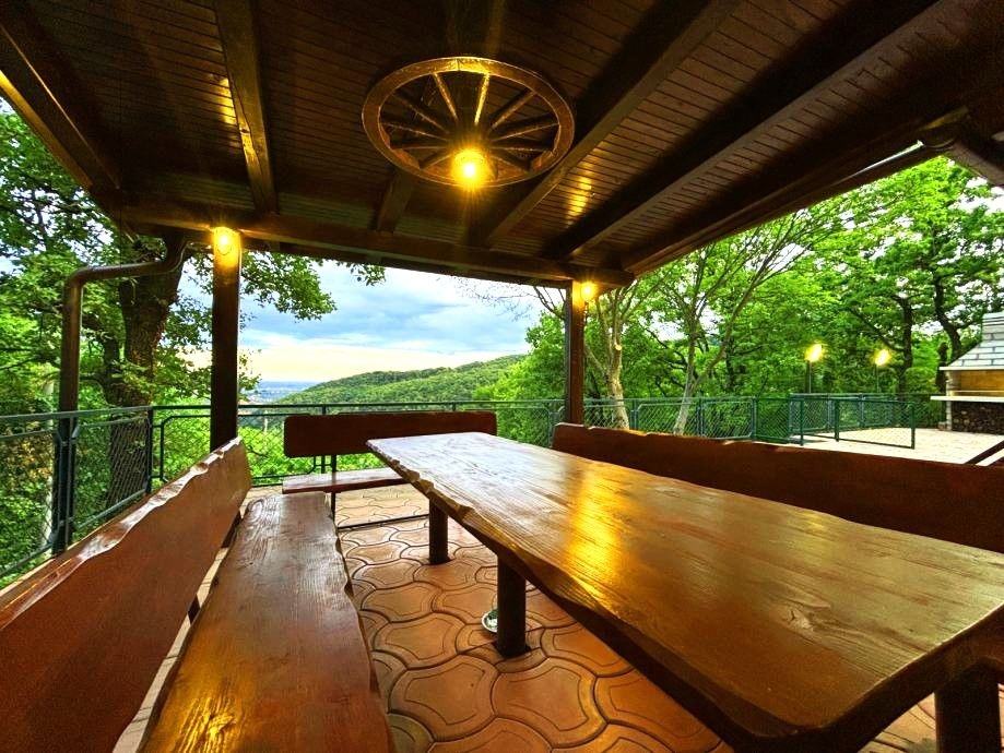 UZ KUĆU JE NADSTREŠNICA POD ČIJIM KROVOM JE MASIVNI DRVENI STOL S KLUPAMA ZA 25 GOSTIJU