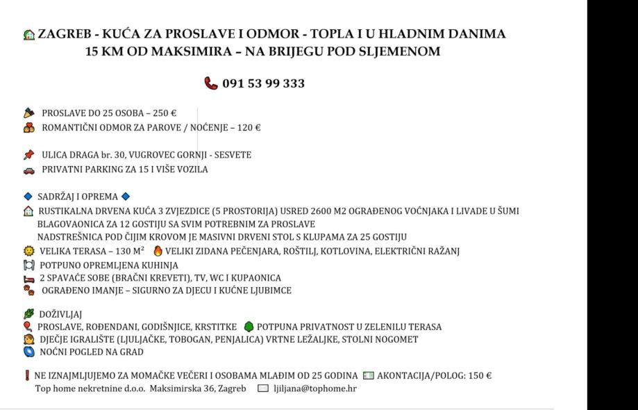 ZAGREB KUĆA ZA PROSLAVE I ODMOR POD SLJEMENOM TOPLA I U HLADNIM DANIMA (iznajmljivanje)