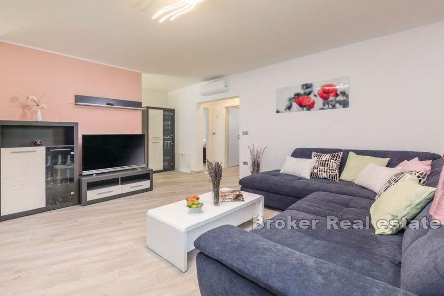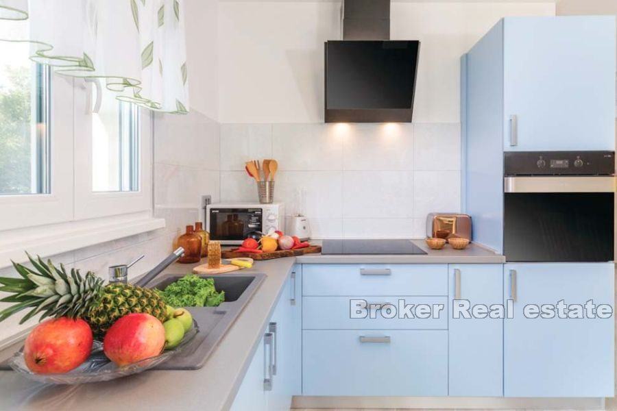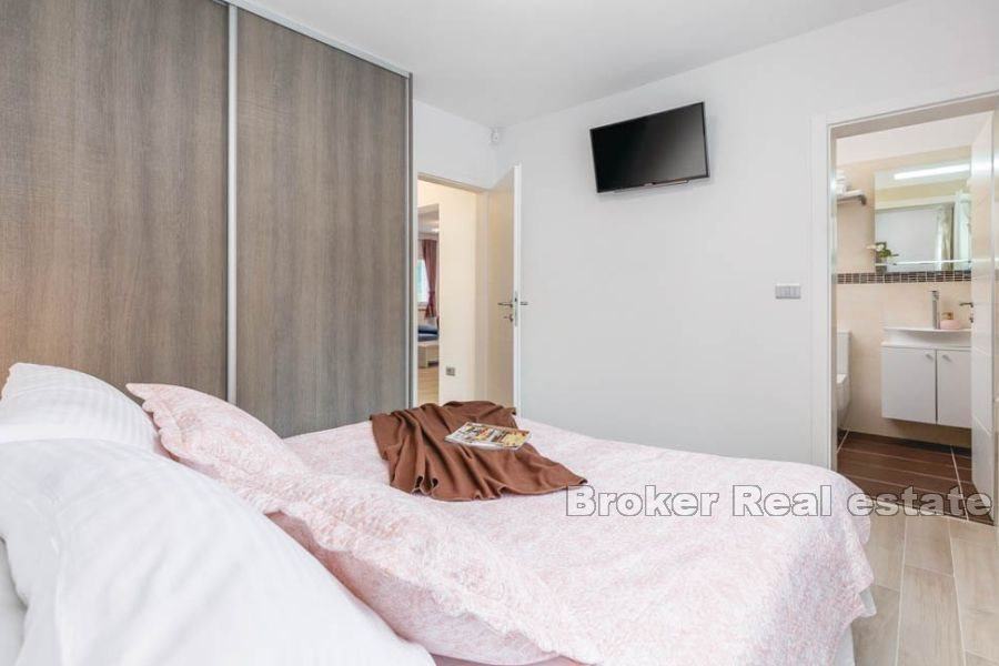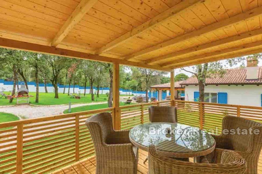 Vanjski prostor se sastoji od lijepo uređene okućnice s mobilnom kućicom, prostorom za druženje s roštiljem, vanjski tuš, dječje igralište za najmlađe te četiri parkirna mjesta.
