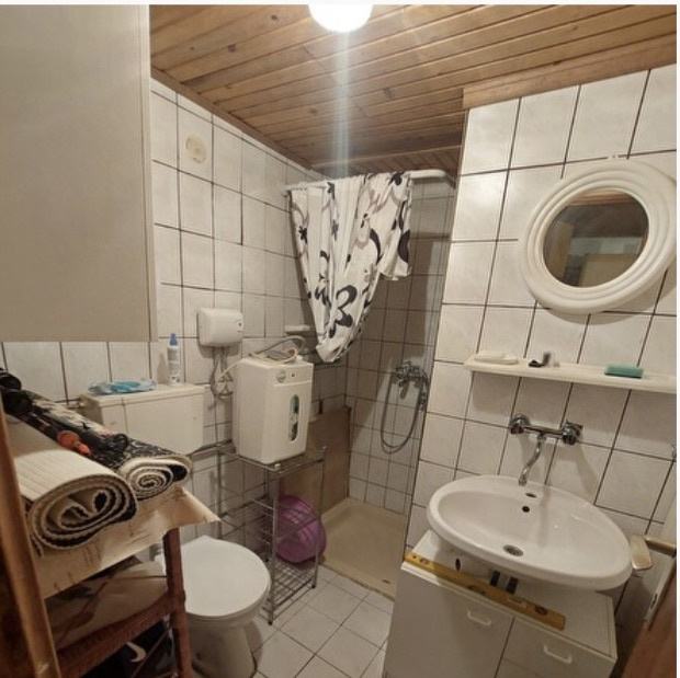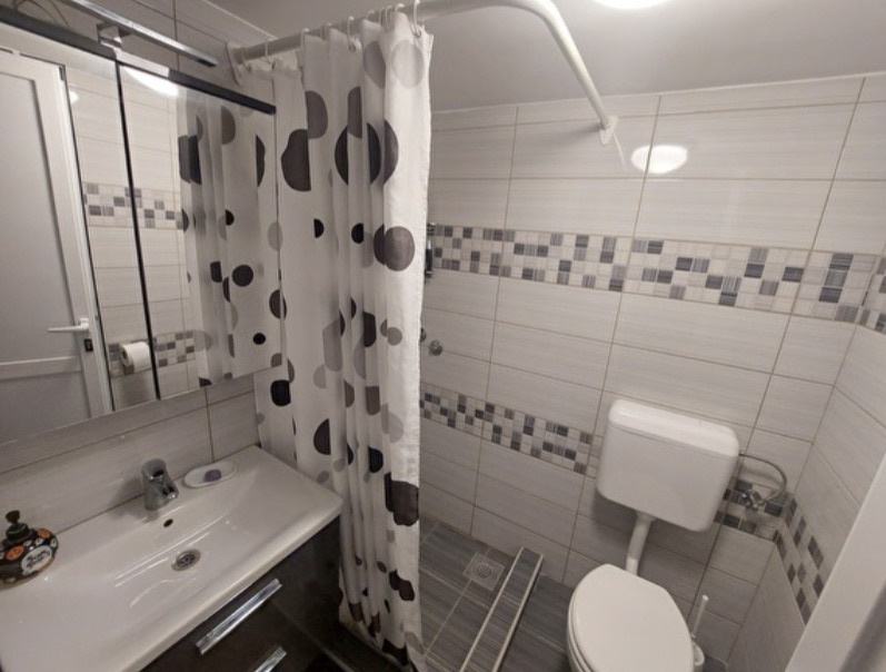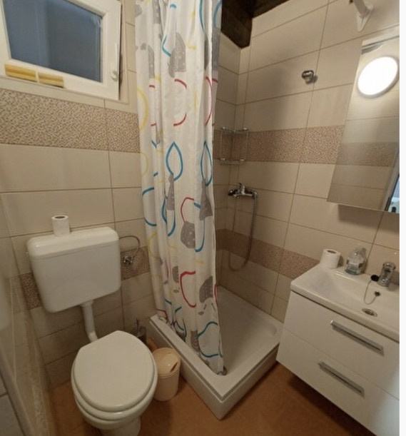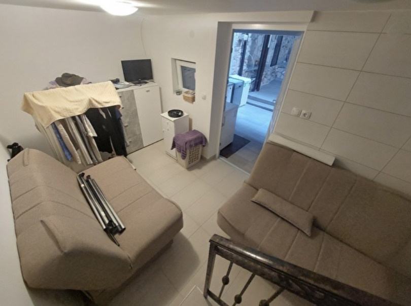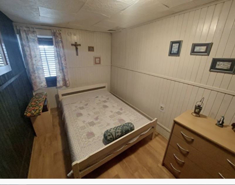 Kuća s desne strane sastoji se od kupatila, spremišta i kuhinje u prizemlju, te dvije spavaće sobe na katu, od kojih jedna ima balkon. Kat je klimatiziran.