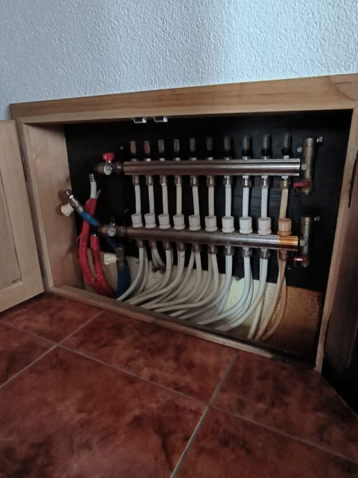 Podno grijanje, pvc stolarija s troslojnim staklima, alu rolete, izolacija s stiroporom 15 cm.