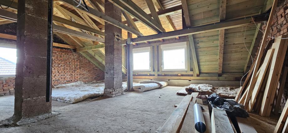 Kuća odmah useljiva. U prizemlju se nalazi kuhinja (+ špajza), dnevni boravak, kupaona, WC. Na katu su tri sobe. Uz kuću se nalazi garaža od 36 m2.