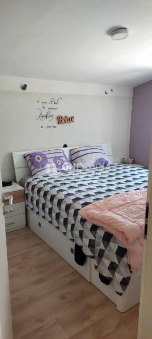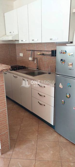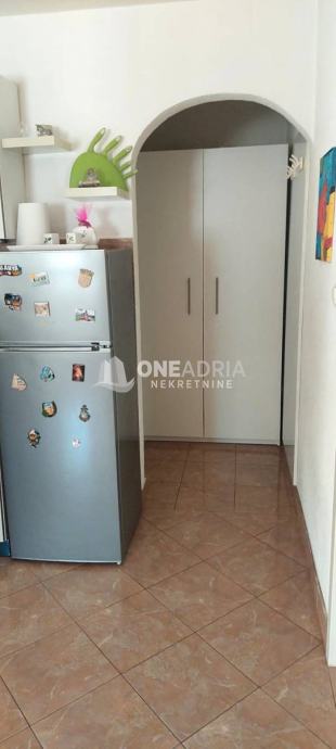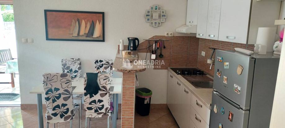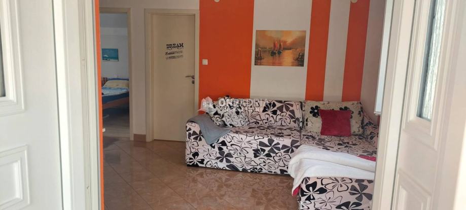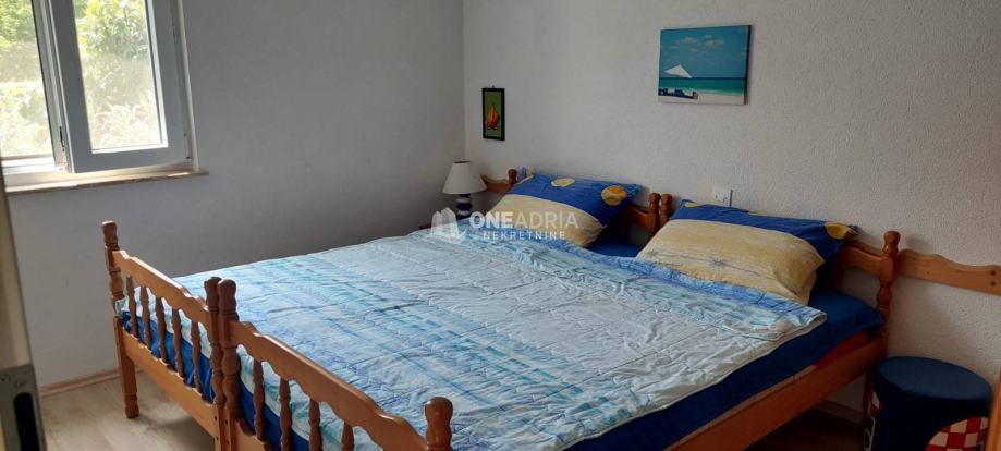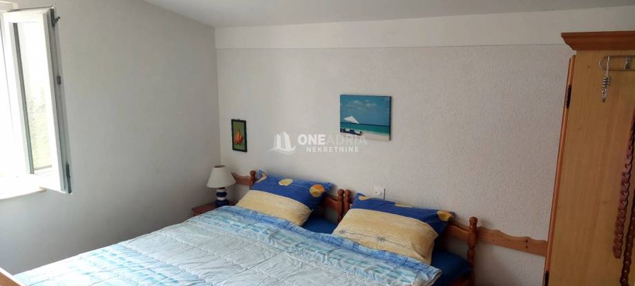 Gornji stan (kat): sastoji se od dvije spavaće sobe, kuhinje s blagovaonicom i dnevnim boravkom, kupaonice te dodatne prostorije koja trenutno služi kao garderoba/ostava (uz mogućnost preuređenja u treću spavaću sobu). Stan ima izlaz na prostranu terasu s pogledom na more.