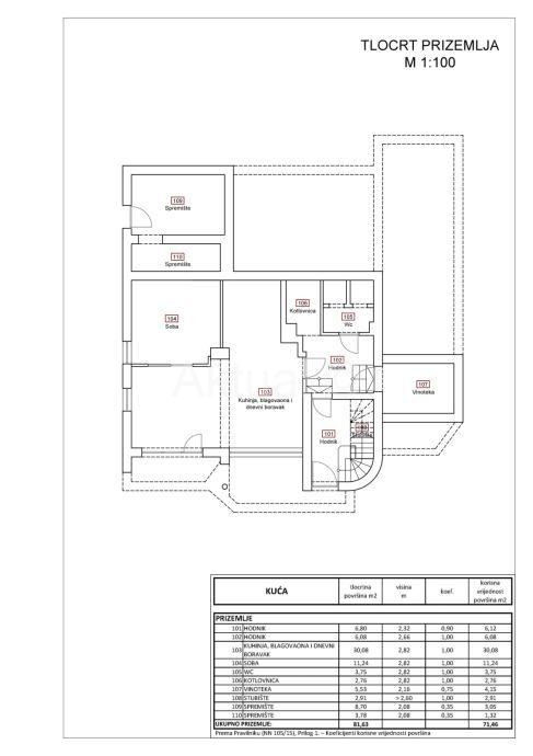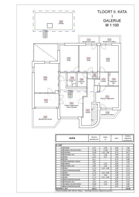 Na prodaju kuća ukupne neto površine 322 m2 koja se sastoji od četiri etaže (prizemlje, I, II kat i galerija). Parcela na kojoj je kuća ima površinu 432 m2.