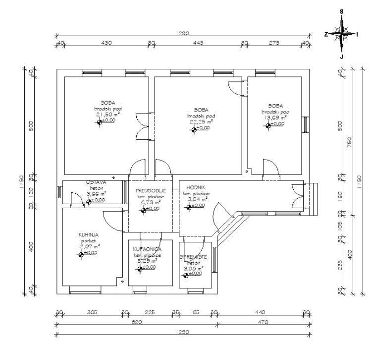 Kuća se sastoji od hodnika, predsoblja, manjeg spremišta, kupaonice, kuhinje i ostave te tri velike sobe.
