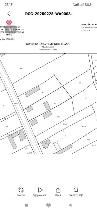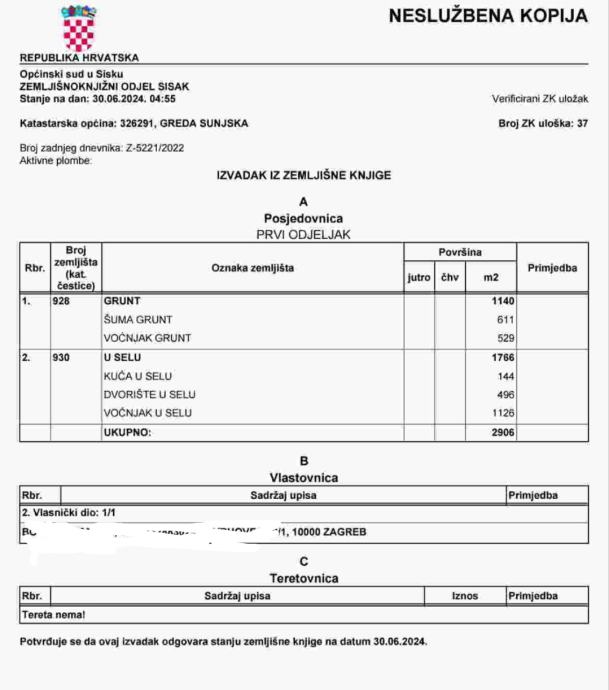 Parcela ima 2906 m2 a kuća s garažom 77 + potkrovlje.