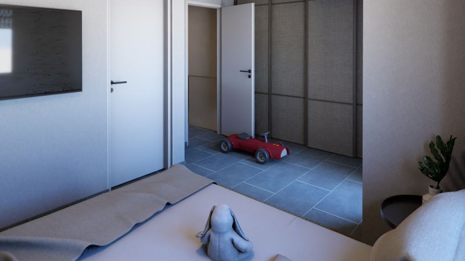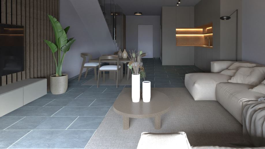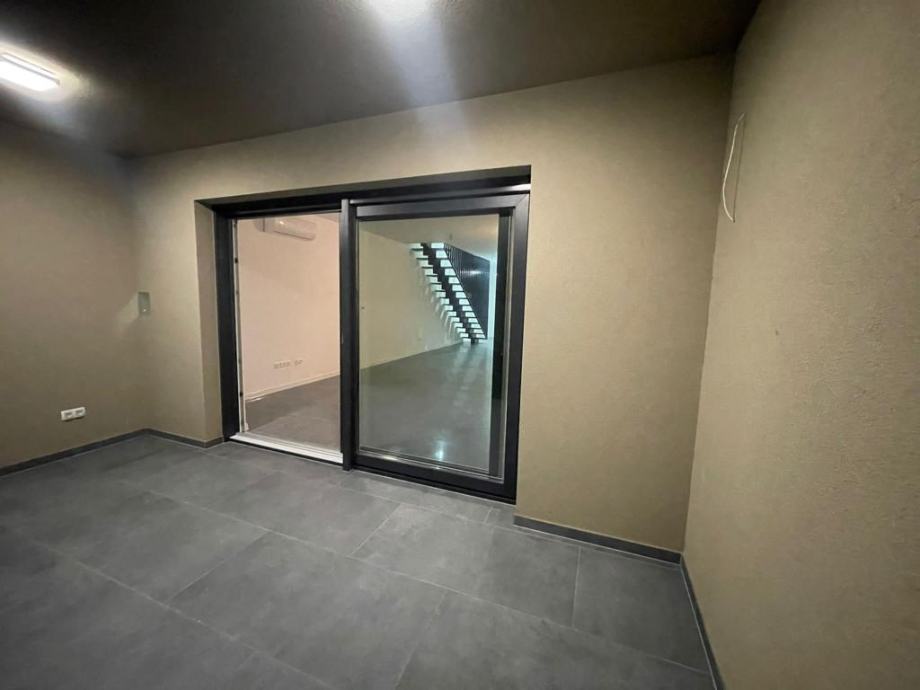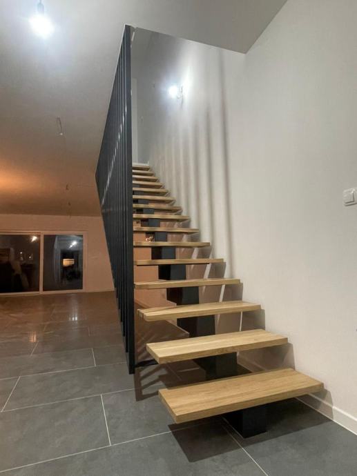 Kuća je dvoetažna sa pomno isplaniranim rasporedom kod kojega je prizemlje osmišljeno kao dnevni dio s velikim otvorenim prostorom (više od 40 m2) predviđenim za dnevni boravak, blagovaonicu i kuhinju, ostavom, WC-om, hodnikom sa stubištem i natkrivenom terasom od 12 m2. Sa terase se izlazi u ograđeno vlastito dvorište površine 40 m2. Na katu se nalaze tri spavaće sobe, lođa, dvije kupaonice s WC-om i hodnik, pri čemu jedna spavaća soba ima vlastitu kupaonicu (en suite) i vlastiti balkon. U svim sobama provedena je instalacija za televiziju i internet.