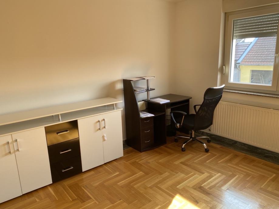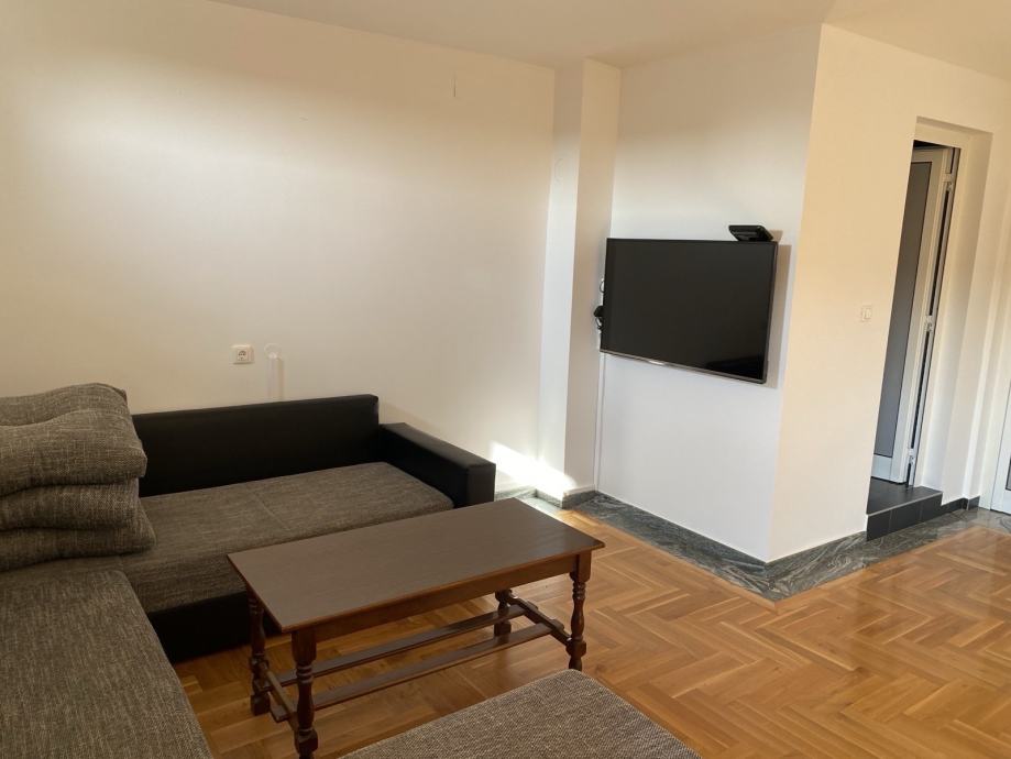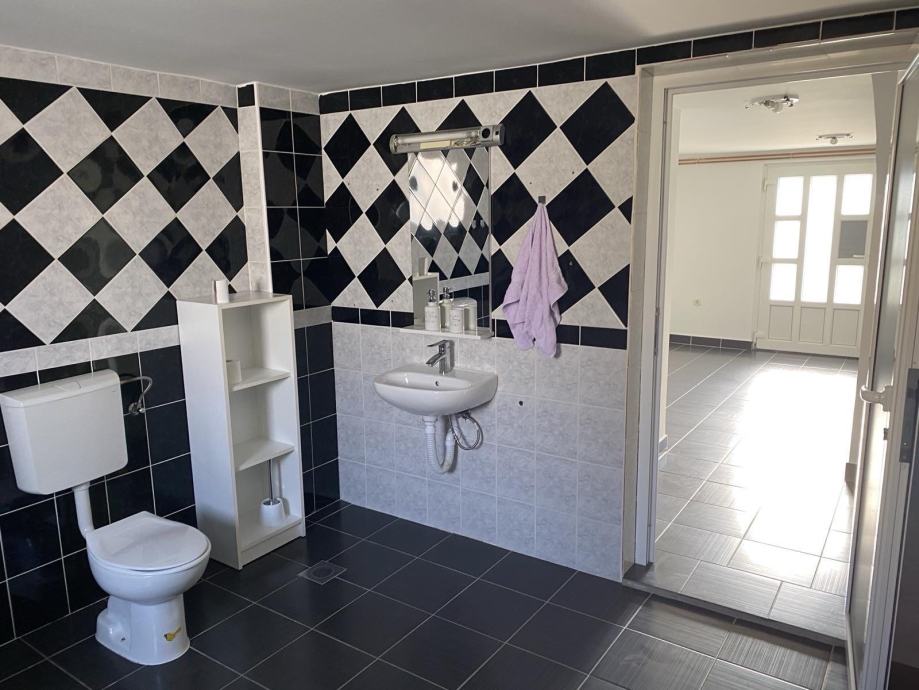 U dvorištu kuće nalaze se stan u prizemlju površine 80m2 i garaža površine 43m2. Stan se sastoji od dnevnog boravka povezanog s kuhinjom i blagovaonicom (open space koncept), 1 sobe, kupaonice, toaleta i hodnika.
