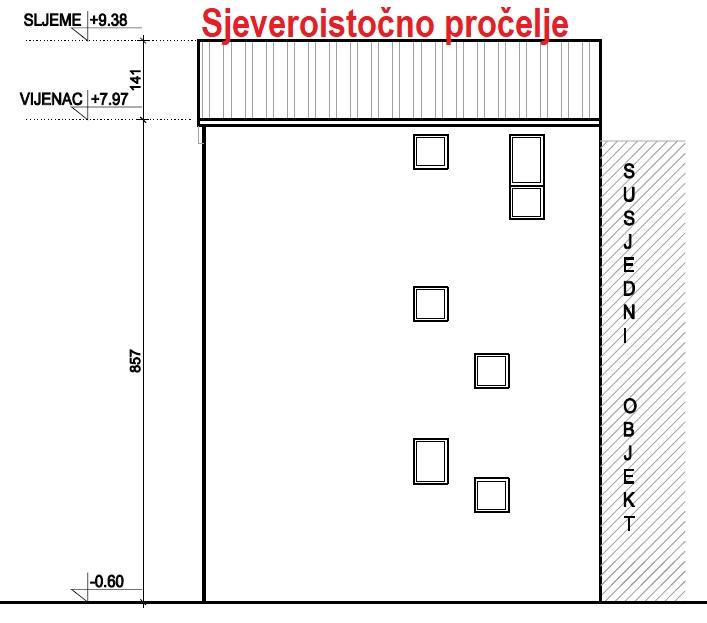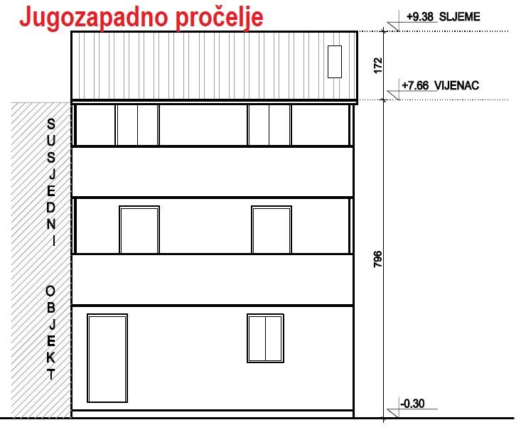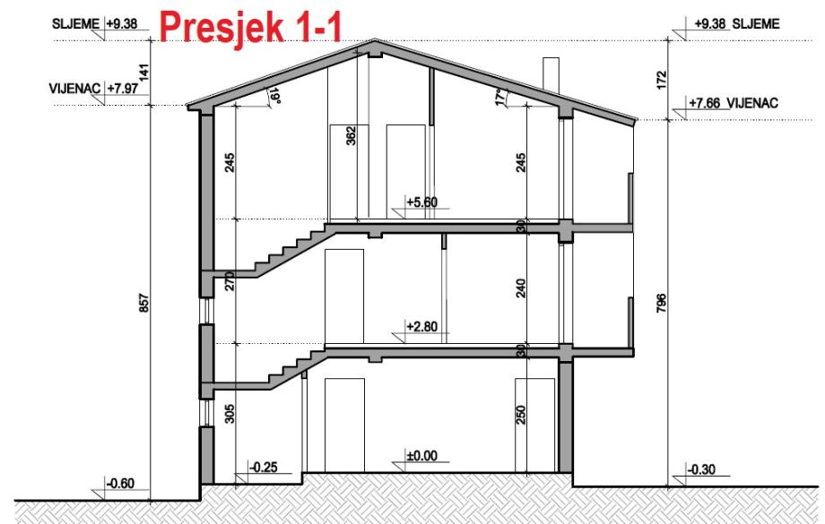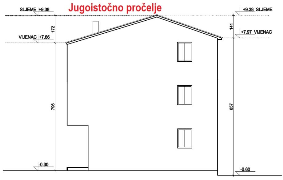 Kuća je južne orjentacije sa južnim balkonom na 2 kata te je katnosti prizemlje + 2 kata sa kosim krovom te unutarnjim stepeništem.