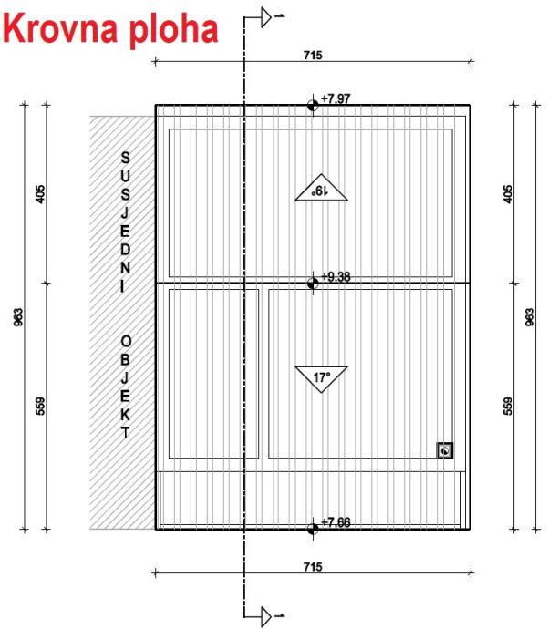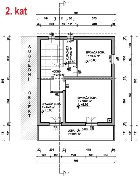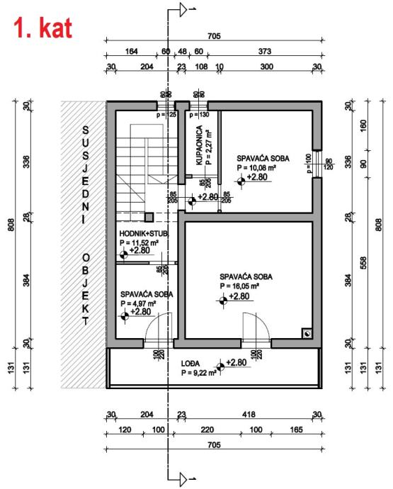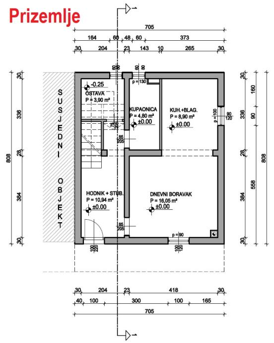 Kuća ima dimenzije 7.05 x 8.08 m (bez balkona), odnosno 7.05. x 9.39 m sa južnim balkonima.