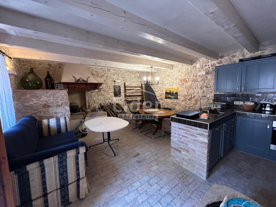 Unutrašnjost kuće kombinira prirodni kamen, ciglu, drvo i bijele cementne žbuke, stvarajući toplu i autentičnu atmosferu. U prizemlju se nalazi funkcionalna kuhinja s blagovaonicom i dnevni boravak s renoviranim kaminom, na podu su stare cigle postavljene u beton. Na katu je smještena nova kupaonica u autohtonom stilu, s keramičkim podovima, te odvojene spavaće sobe za dvije osobe. Hodnik i sobe opremljeni su novim brodskim podovima.