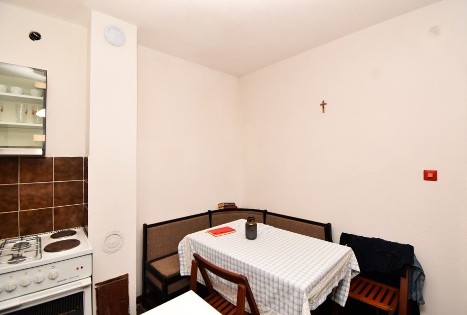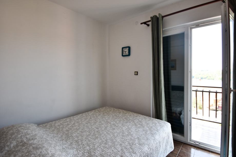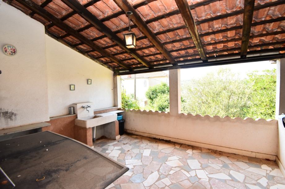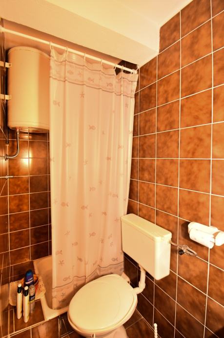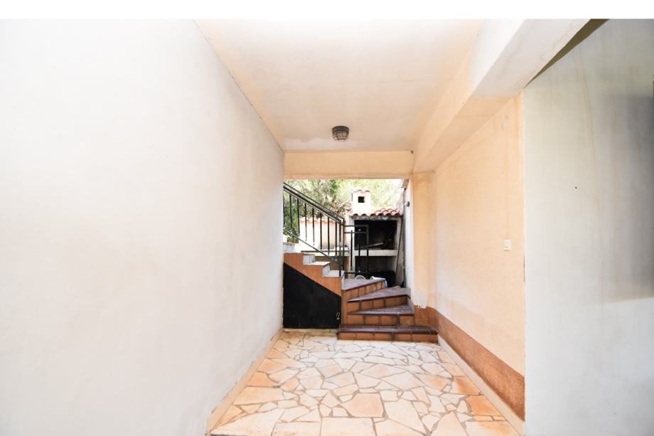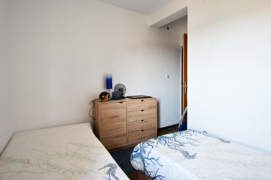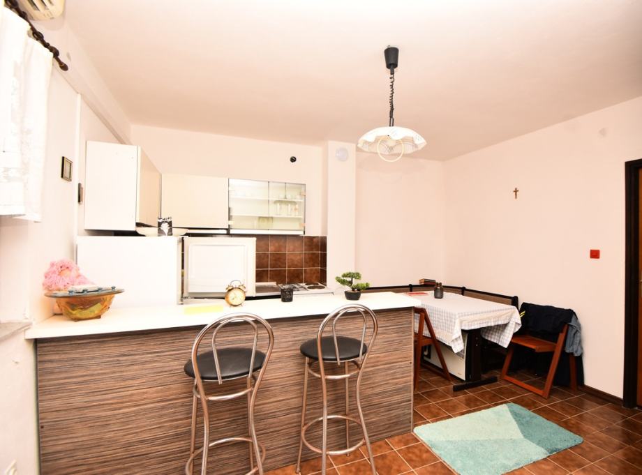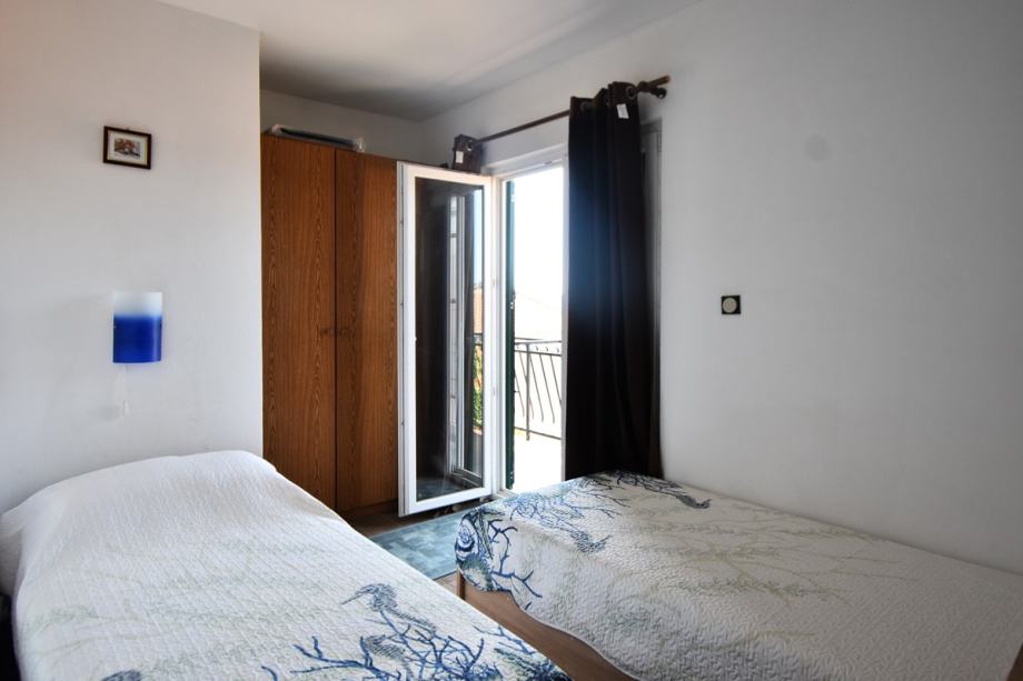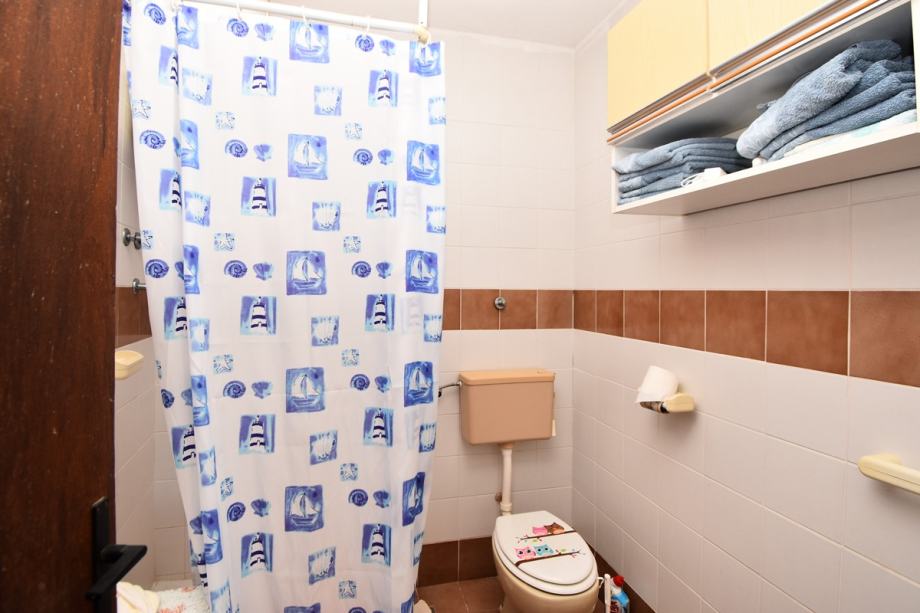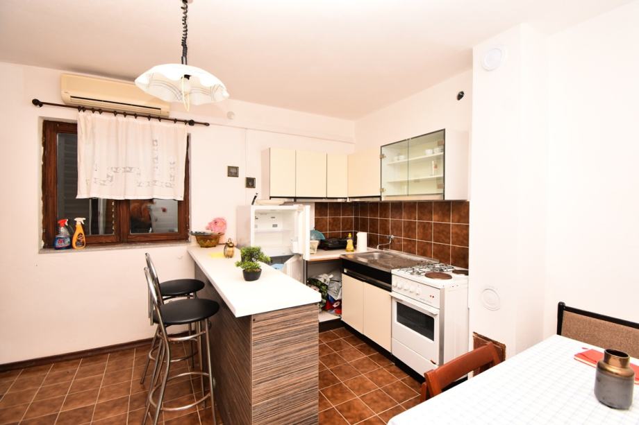 Na maloj uzvisini, s pogledom na more, i parceli površine 226 m2, nalazi se odmah useljiva kuća s dva stana. Na prizemnoj etaži se u jednom dijelu nalazi spavaća soba i kupaonica s terasom ispred, a u drugom dijelu kuhinja i dnevni boravak s lijepom nastrešnicom ispred, s mnogo prostora za vanjsku garnituru i opuštena druženja. Privatnost nudi i vrt te živica koja omeđuje kuću. U stražnjem, lako dostupnom dijelu, se nalazi roštilj. Vanjske stepenice vode na gornju etažu gdje su tri spavaće sobe, dvije kupaonice, kuhinja, blagovaonica te terasa s predivnim pogledom na more.