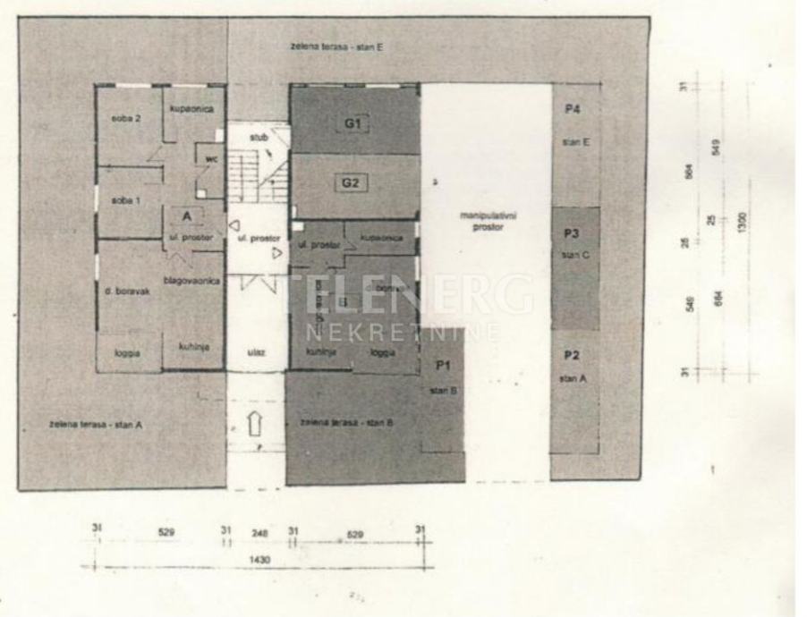 Stan B u prizemlju koji se sastoji od ulaznog prostora, dnevnog boravka s blagovaonicom, kuhinje i kupaonice s toaletom, loggie i terase (NKP 42,60 m2)