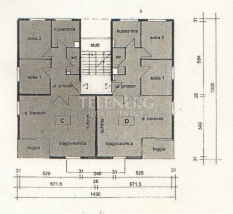 Stan D na prvom katu koji se sastoji od katu koji se sastoji od ulaznog prostora i hodnika, dnevnog boravka s blagovaonom i kuhinjom, dvije sobe, kupaonice, toaleta i loggie (NKP 72,44 m2).