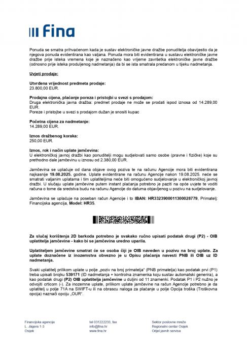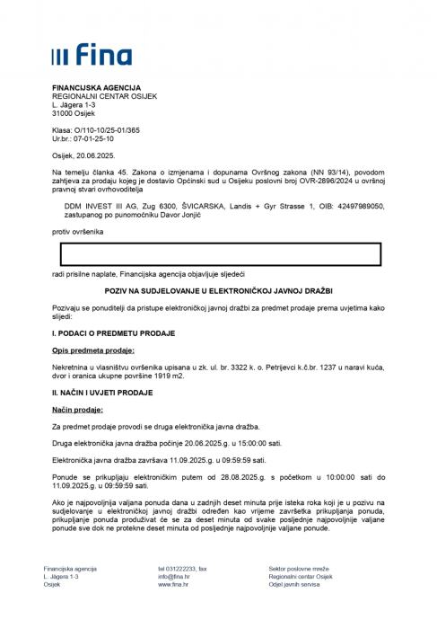 Druga elektronička javna dražba počinje 20.06.2025.g. u 15:00:00 sati.