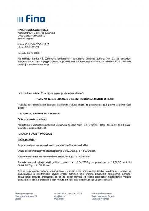 Druga elektronička javna dražba počinje 05.02.2026.g. u 15:00:00 sati.
