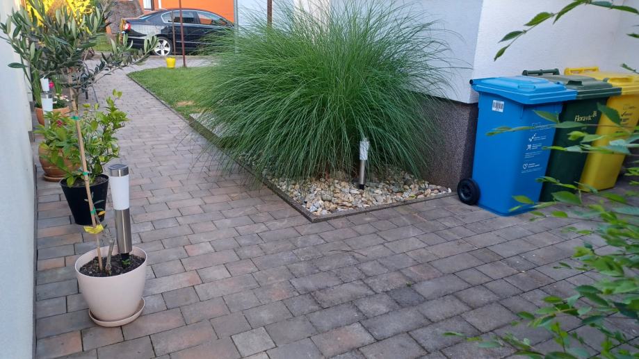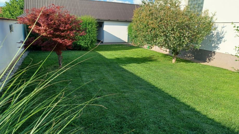 Iza kuće se nalaze pomoćne prostorije: garaža, ljetna kuhinja, prostorija za druženje, drvarnica i natkriveni prolaz za vrt. Kuća ima podrum. Iza kuće je vrt. Ispred kuće su parkirna mjesta za dva automobila.