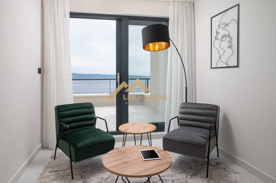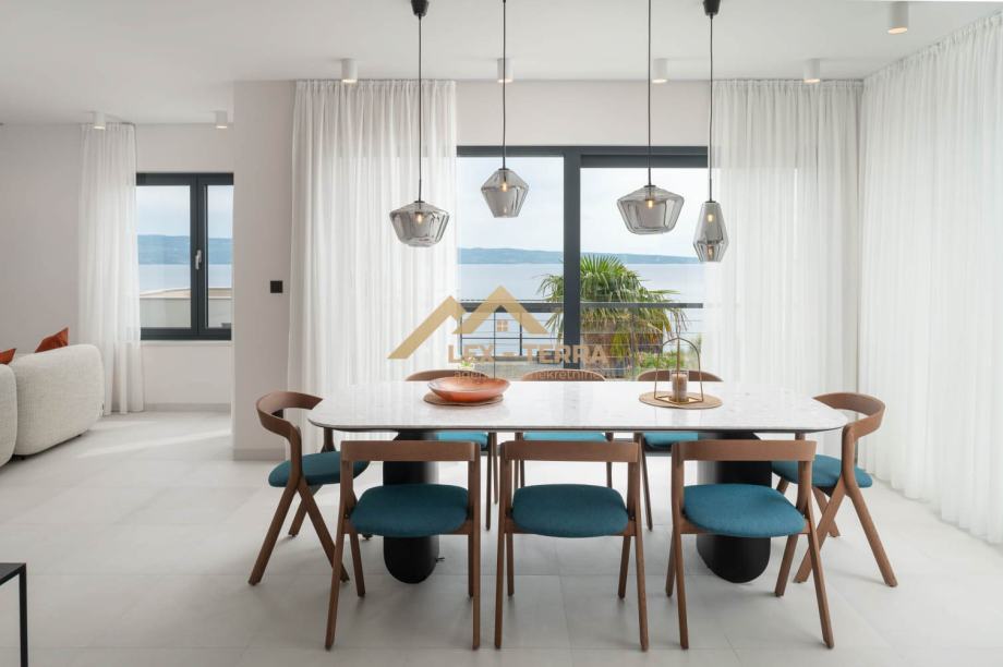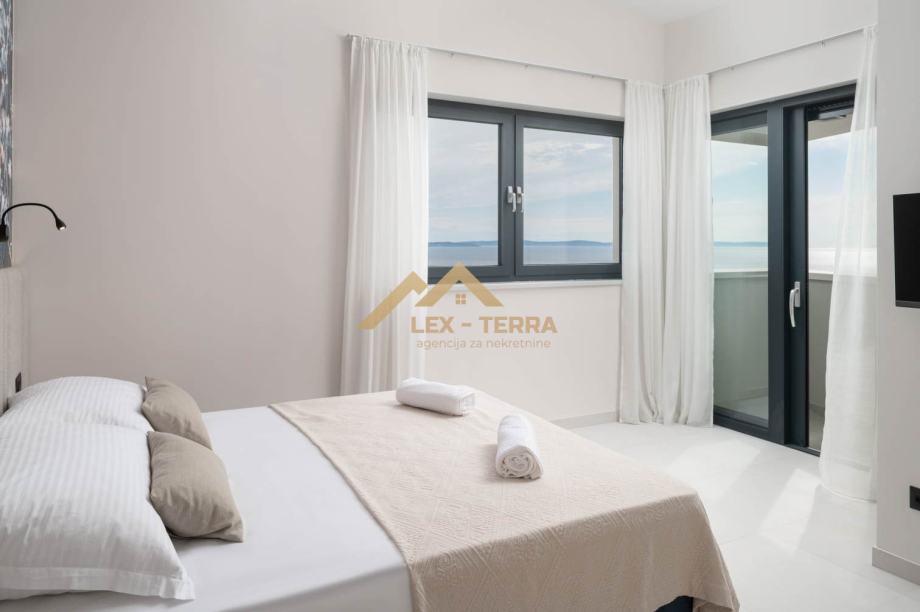 Na prvom katu nalaze se tri prostrane spavaće sobe, svaka sa svojom kupaonicom, dok dvije sobe imaju izlaz na loggie s kojih se pruža otvoren pogled na more.