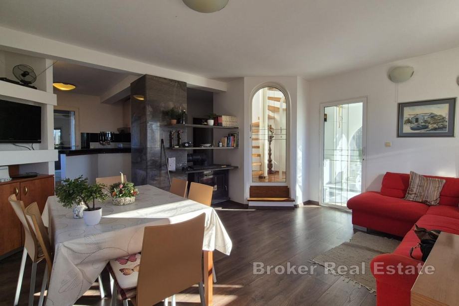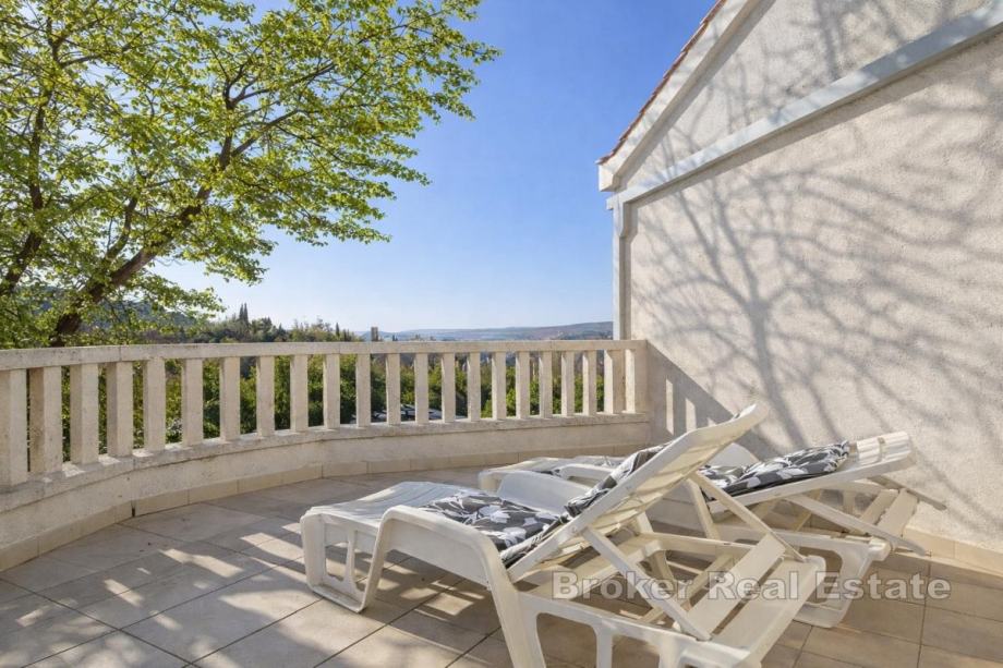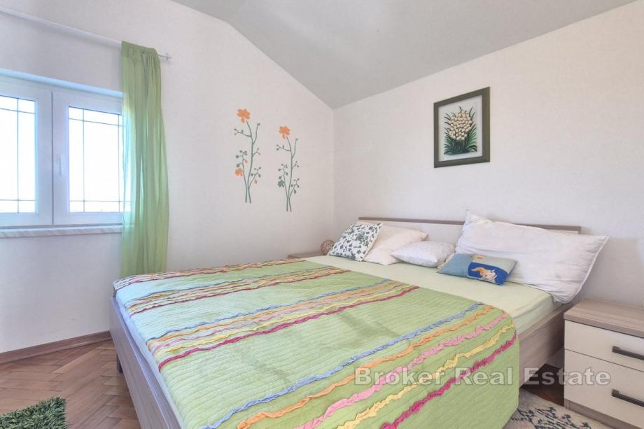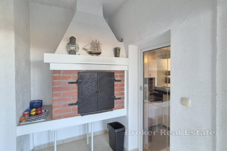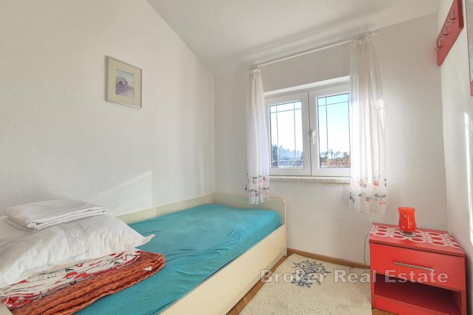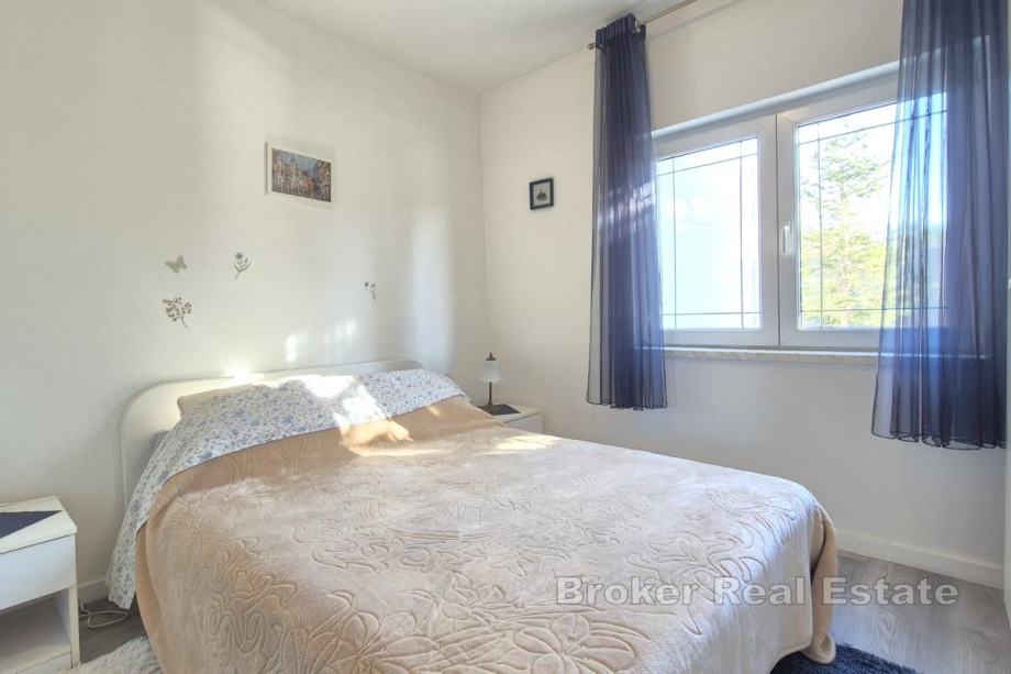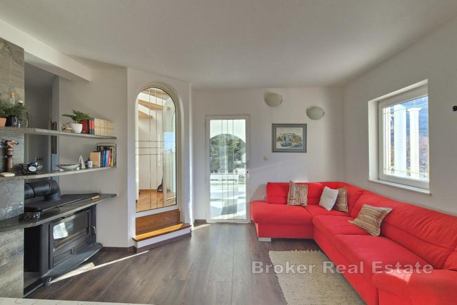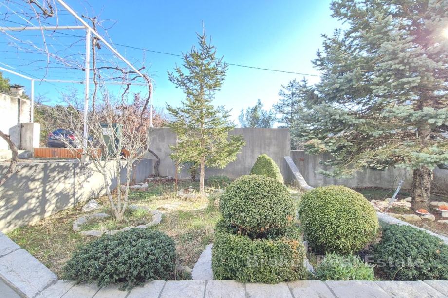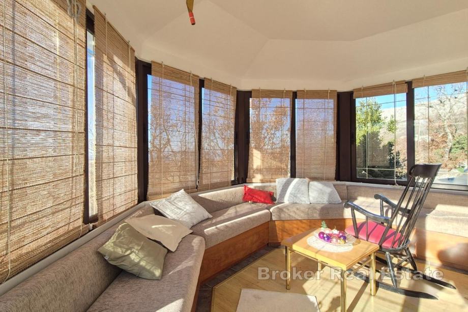Kuća se nalazi na parceli od 850 m² s mogućnošću izgradnje bazena. Prizemlje obuhvaća kuhinju, blagovaonicu i dnevni boravak, spavaću sobu, kupaonicu, dva zimska vrta te spremište s direktnim ulazom u garažu. Na gornjoj etaži nalaze se tri spavaće sobe, kupaonica te dodatna prostorija uređena kao dnevni boravak s manjom kuhinjom i izlazom na terasu. Kuća ima unutarnji kamin, a u pomoćnom objektu, konobi, nalazi se još jedan kamin. Uz garažu osigurana su i dva vanjska parkirna mjesta. Lokacija je pogodna za rafting, biciklizam i planinarenje, dok su plaže udaljene približno 15 minuta vožnje.