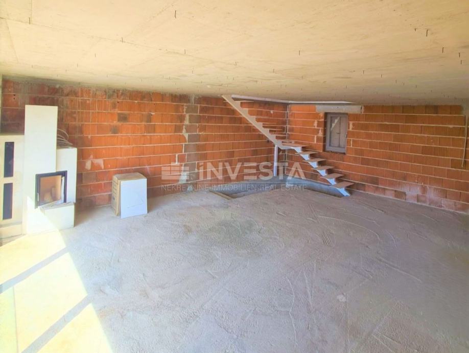 Kuća je završena izvana, s modernom fasadom i potpuno novom vanjskom stolarijom, što joj daje atraktivan izgled. Svi potrebni priključci za struju i vodu su postavljeni, dok unutarnje instalacije još nisu dovršene, pa će biti potrebno dodatno ulaganje kako bi se kuća dovršila.