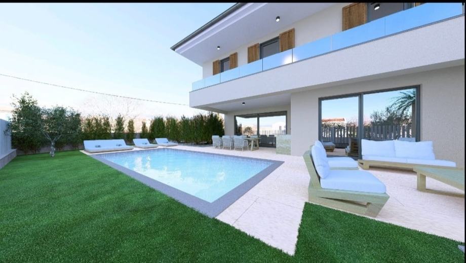 U prizemlju se nalazi otvoren i funkcionalno organiziran dnevni prostor koji objedinjuje dnevni boravak, kuhinju i blagovaonicu, s direktnim izlazom na terasu i bazen, uz ulazno predvorje, ostavu / vešeraj i zaseban WC. Na katu su smještene tri spavaće sobe, tri kupaonice te balkon.