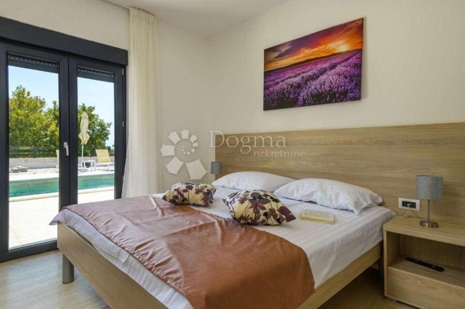 U prizemlju nalazimo open space kuhinju, blagovaonu i dnevni boravak, jednu spavaću sobu s kupaonicom i saunom te spremište ispod stepenica i još jednu zajedničku kupaonicu. Iz dnevnog dijela i spavaće sobe se izlazi direktno na bazen.