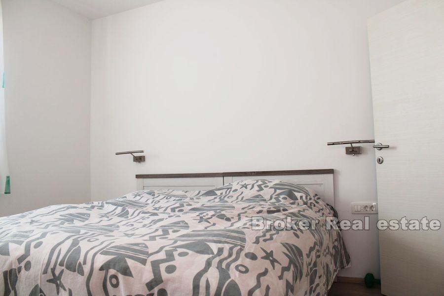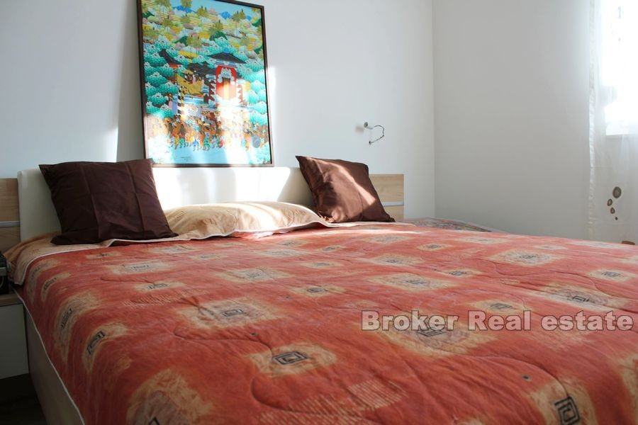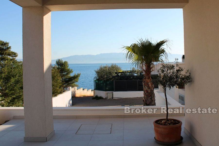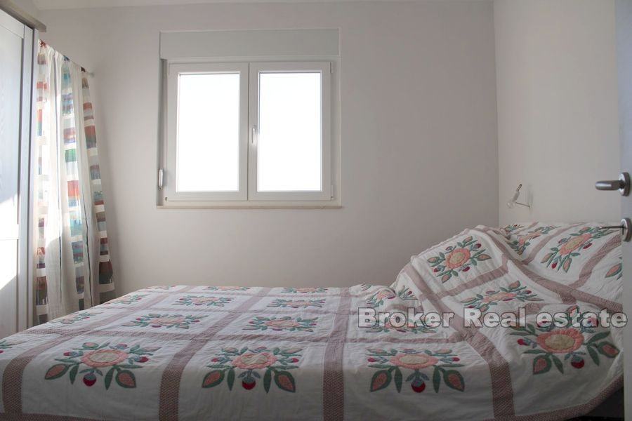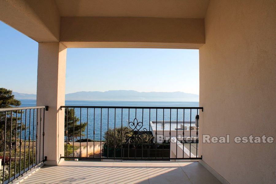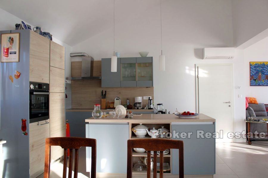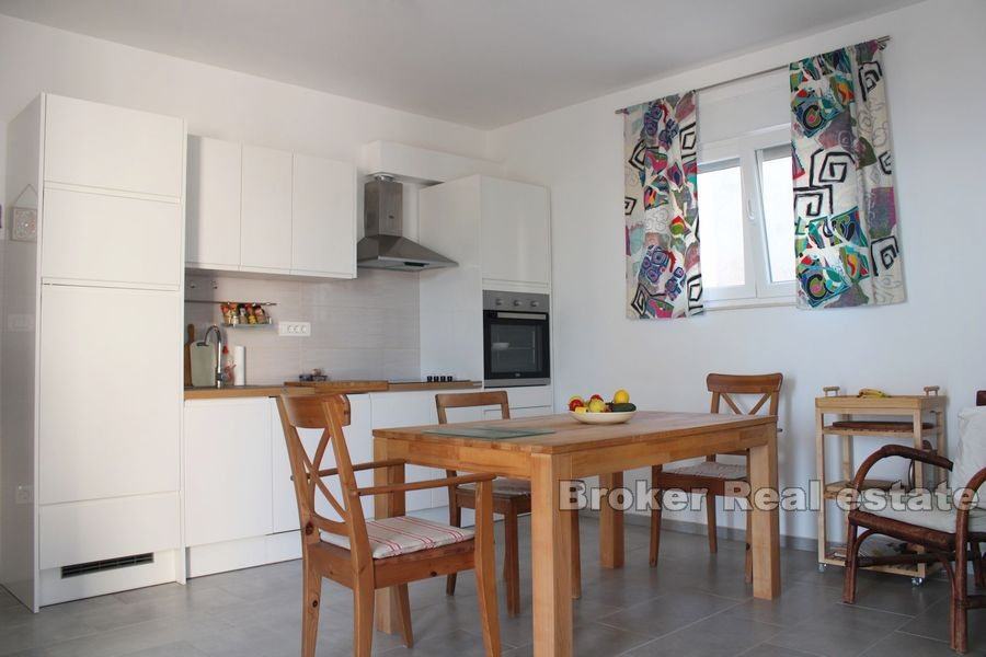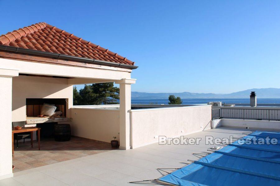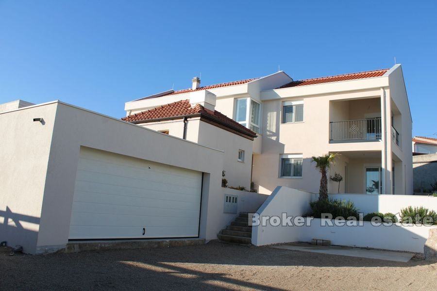 Kuća se sastoji od 2 etaže stambene površine 260 m2 i 700 m2 zemljišta. Na prvoj etaži se nalaze 2 apartmana od kojih se svaki sastoji od 1 sobe, kupatila, kuhinje, dnevnog boravka i blagavaonice. Iz apartmana se izlazi na prekrasnu terasu s bazenom i roštiljem. 2 etaža se sastoji od dvije spavaće i jedne radne sobe, dvije kupaonice, balkona, dvije terase, te prostranog dnevnog boravka s kuhinjom i blagovaonicom. S terasa se pruža prekrasan pogled na more. Nekretnina je opremljena bazenom, garažom, podnim grijanjem i klima uređajima. Kuća se nalazi u blizini svih potrebnih sadržaja poput restorana, cafe barova, prodavaonica s namirnicama, plaže.