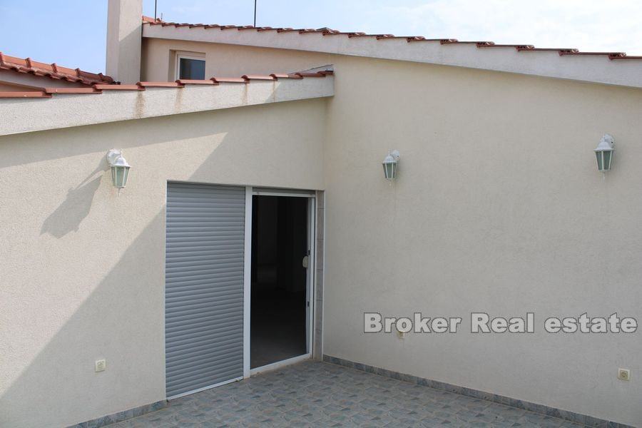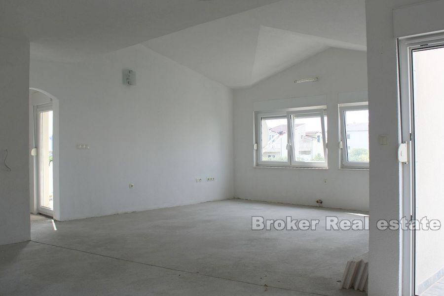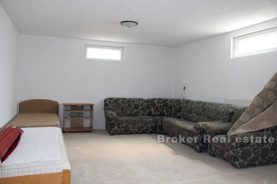 U prizemlju se nalazi garaža iz koje se ulazi direktno u kuću i apartmana koji je nedovršen te se sastoji od kupaonice, dnevnog boravka, kuhinje i 2 sobe. Prvi kat se sastoji od dnevnog boravka, 3 sobe, kuhinje s blagavaonicom, kupaonicom, velikom vrtnom terasom. Na drugom katu koji je potrebno dovršiti nalaze se 3 spavaće sobe, kupaonica, 2 terase s pogledom na more.
