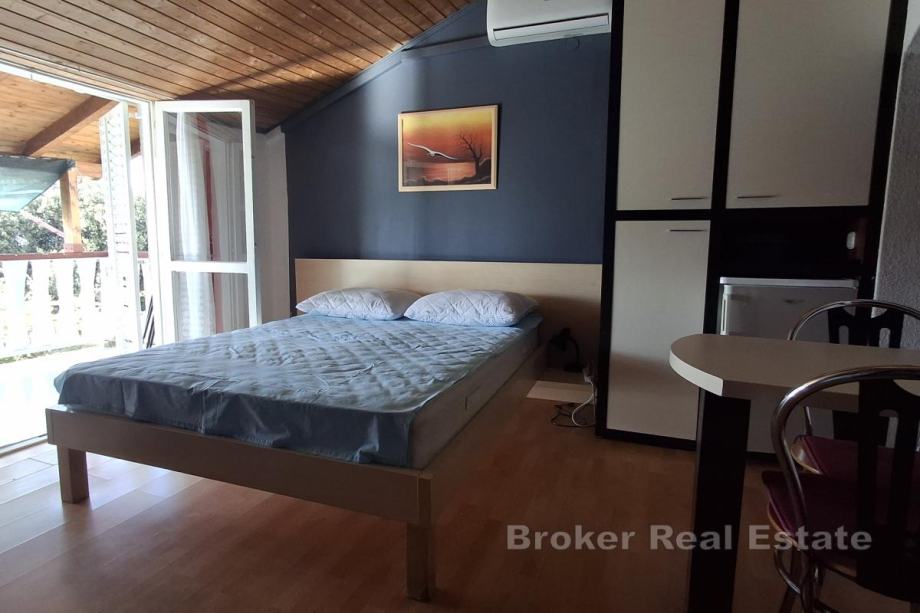 Prvi kat sastoji se od: dva apartmana s kuhinjom, kupaonicom i dvije spavaće sobe, jednog apartmana s kuhinjom, dnevnim boravkom, galerijom, kupaonicom, dva studio apartmana, potpuno funkcionalna i spremna za iznajmljivanje.