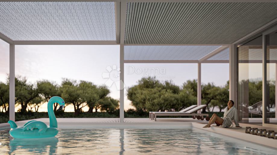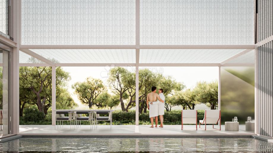 Eksterijer vile istinska je oaza – prostrana terasa s impresivnim pogledom na more, privatni bazen površine 26,60 m² te vanjska kuhinja i lounge zona savršeno su mjesto za objedovanje i opuštanje na otvorenom u duhu mediteranskog načina života. Parkiralište od 77,24 m² osigurava prostor za dva vozila i lak pristup nekretnini.