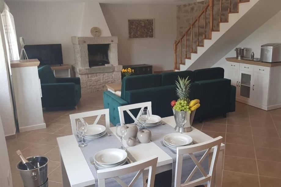 Prizemlje se sastoji od kuhinje s prostranom blagovaonicom,kupaonica,dnevnim boravkom s unutarnjim kaminom koji pruža u zimskim uvjetima ugodnu atmosferu grijanja na drva a u ljetnom periodu klima uređajima.