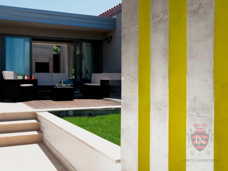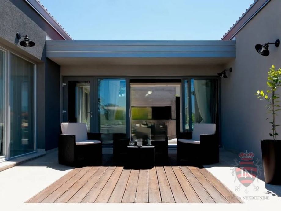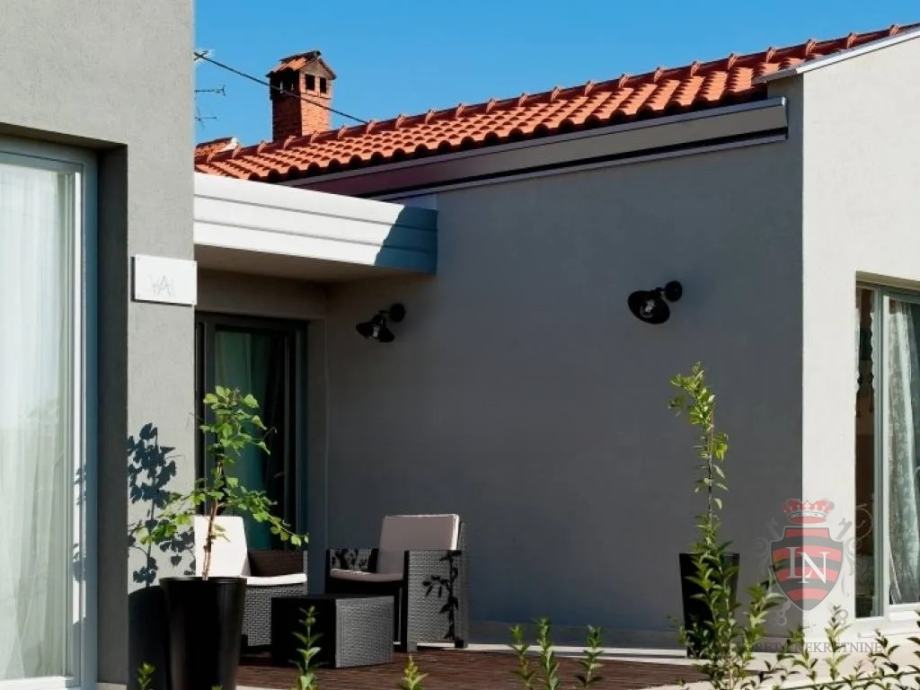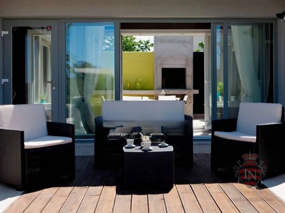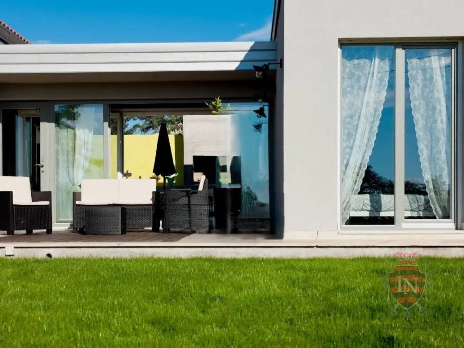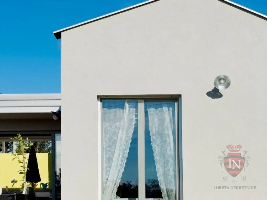 U vanjskom dijelu okućnice ističe se prekrasan bazen s idealnim sunčalištem, zaštićen visokim zelenilom koje pruža privatnost i mir. Tu je i šarmantni atrij s kaminom i velikim stolom – savršen za ugodna druženja, obiteljske večeri ili prijateljska okupljanja. Kuća je opremljena inverter klima uređajima koji omogućuju učinkovito grijanje i hlađenje tijekom cijele godine, a njezina montažna konstrukcija garantira brzo i jednostavno održavanje.