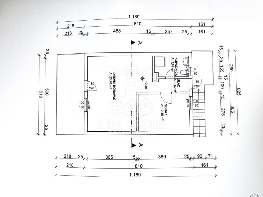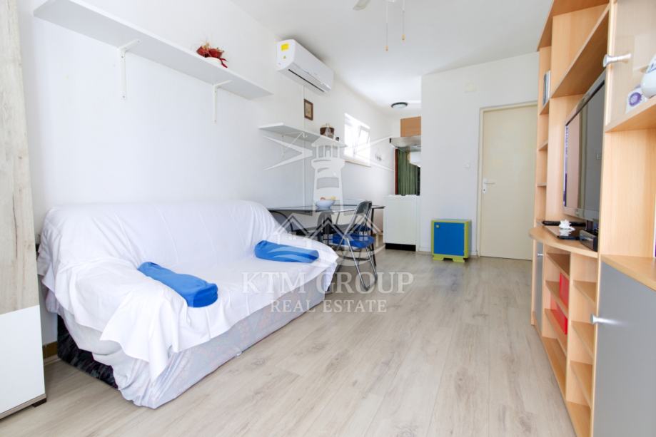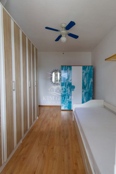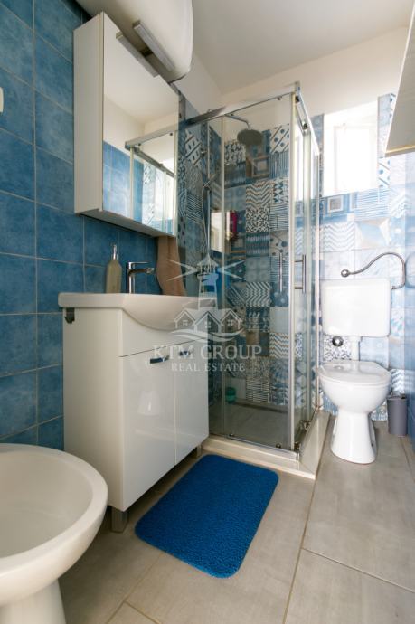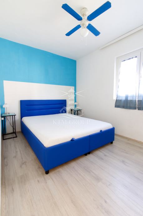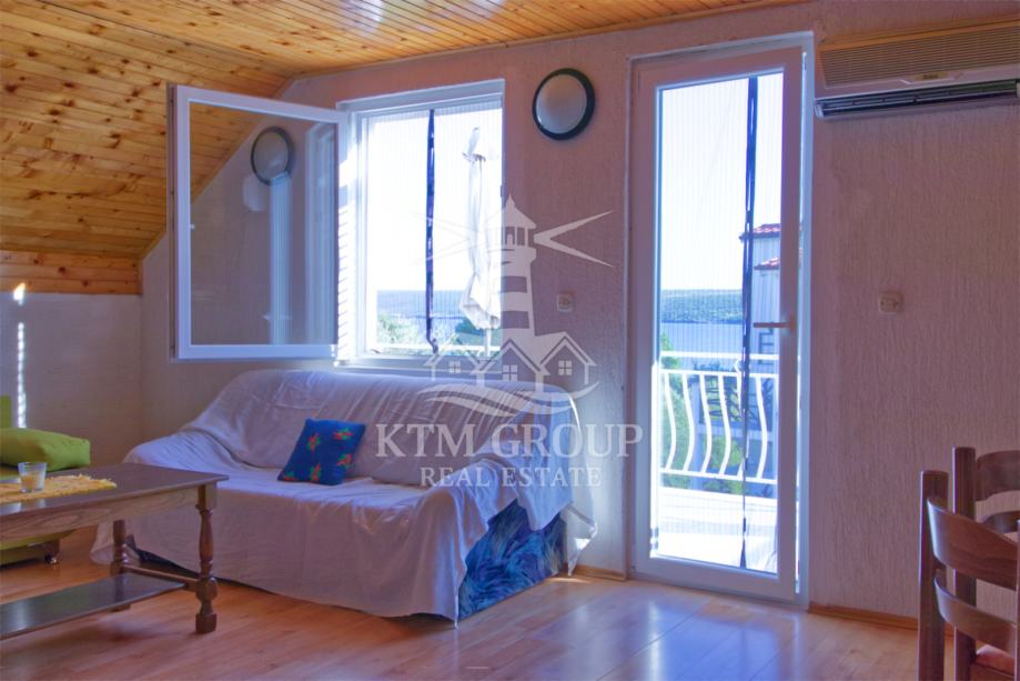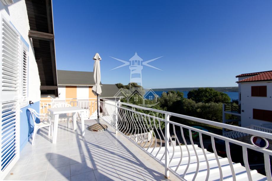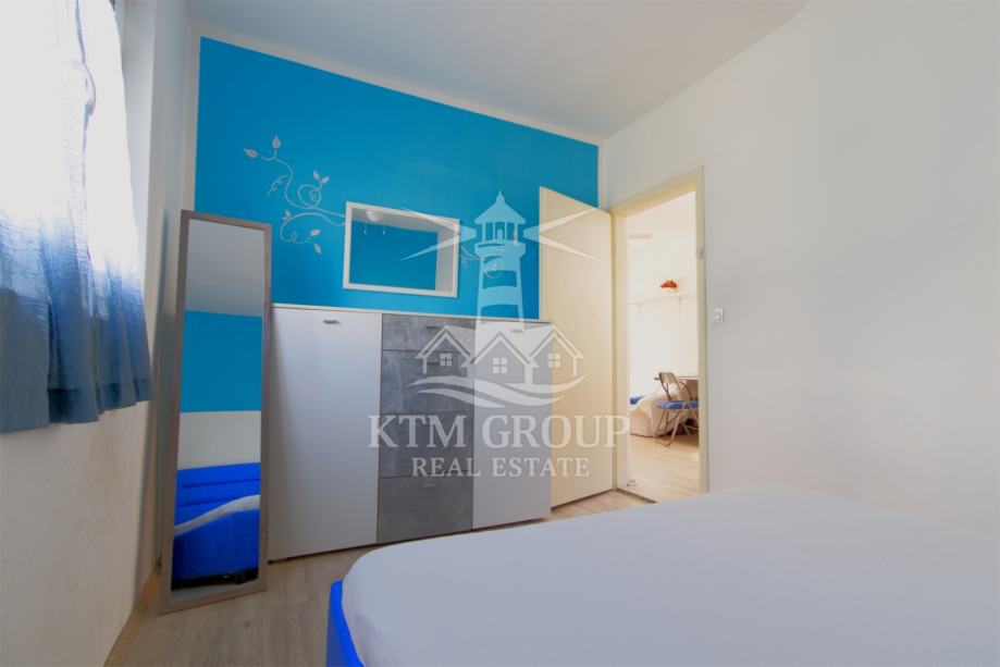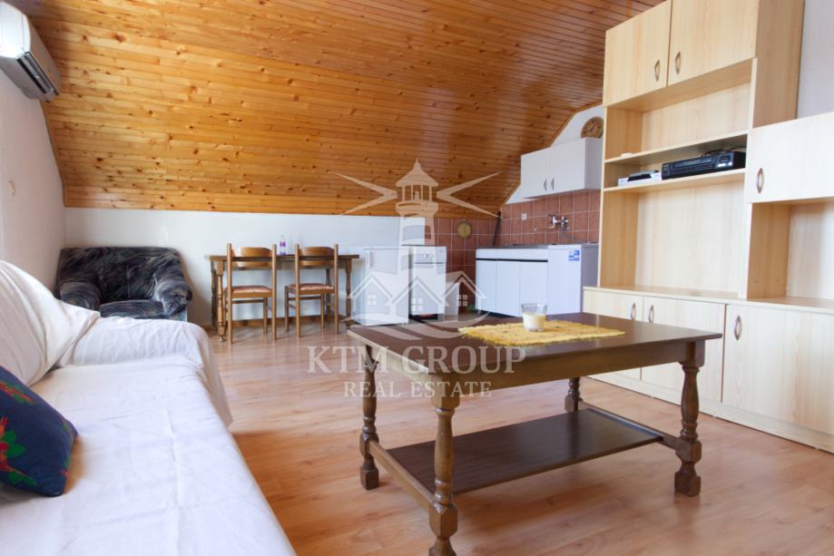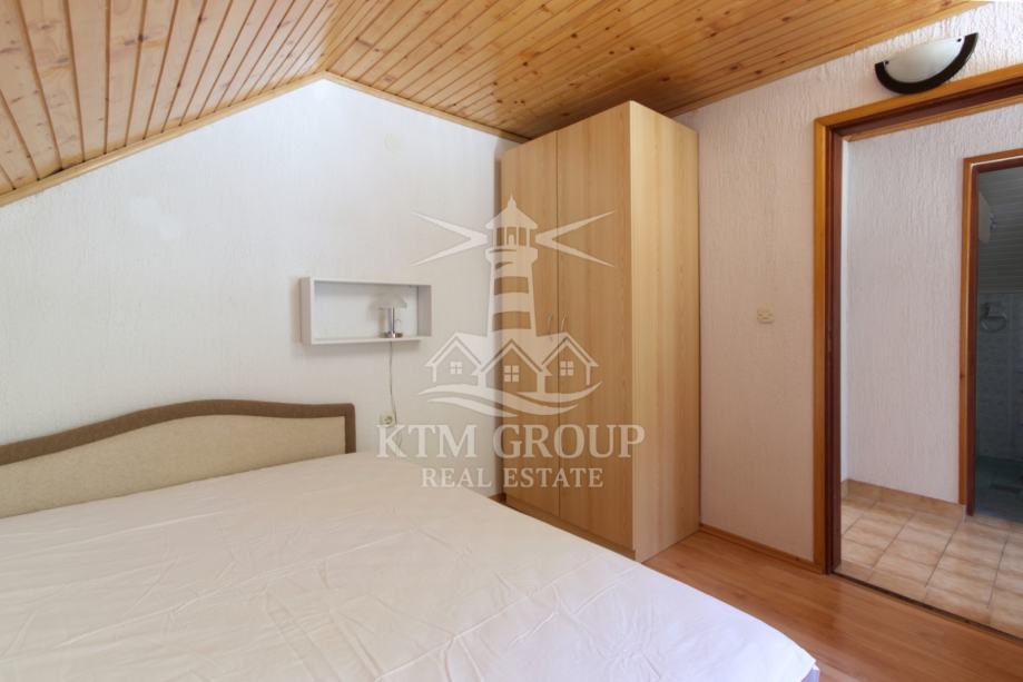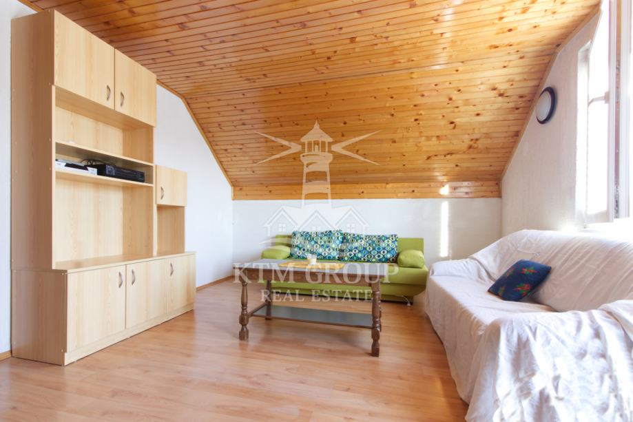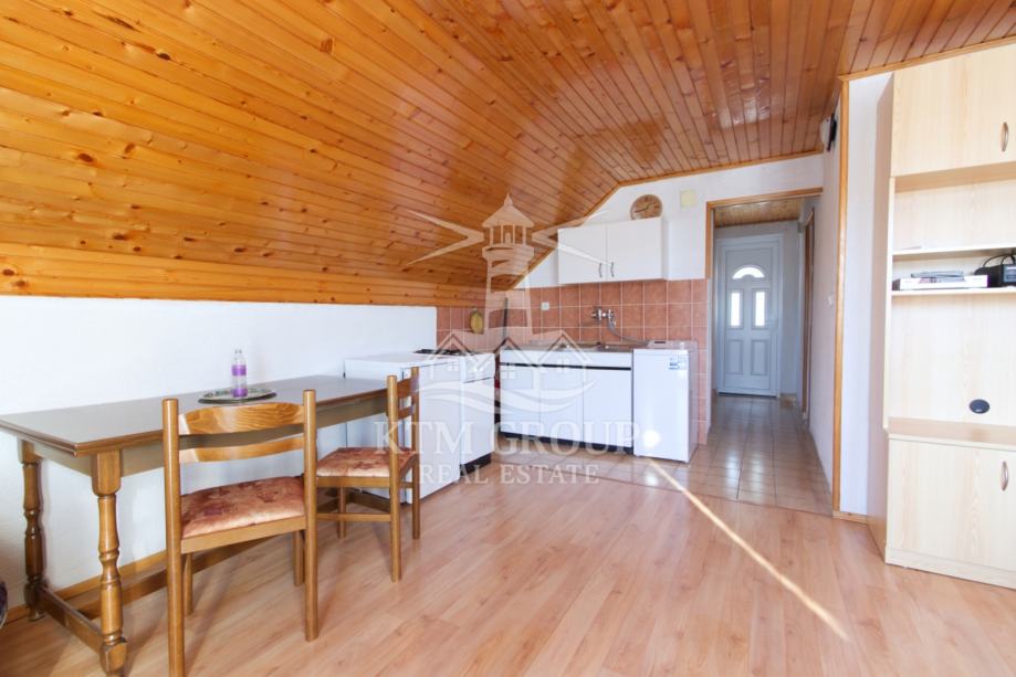 Na katu se nalazi jednosobni apartman od 42 m², s kuhinjom i dnevnim boravkom u kojem je smješten dodatni ležaj, spavaćom sobom i kupaonicom. Iz dnevnog boravka izlazi se na prostranu terasu s prekrasnim pogledom na more – savršeno mjesto za odmor i opuštanje.