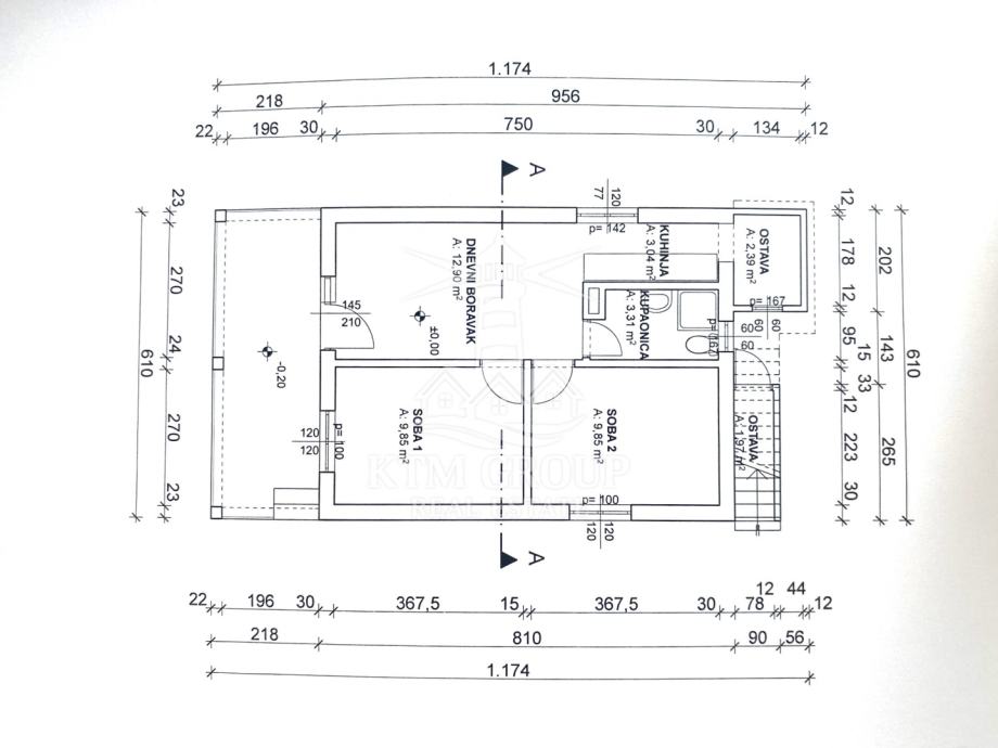 U prizemlju kuće smješten je dvosobni apartman površine 61 m², koji se sastoji od kuhinje s ostavom i dnevnim boravkom, dvije spavaće sobe i kupaonice. Na ulazu se nalazi velika natkrivena terasa, idealna za uživanje na otvorenom tijekom većeg dijela godine. Apartman ima i priključak za peć na drva, što omogućuje ugodan boravak i u zimskim mjesecima.