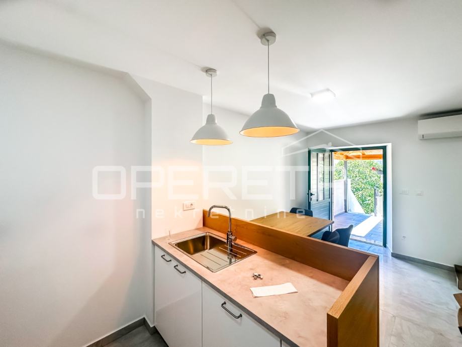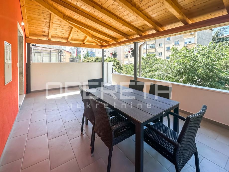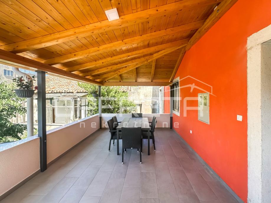 Na katu i potkrovlju smješten je prostrani, dvoetažni stan ukupne površine 130 m². Stan je kompletno obnovljen i uređen s naglaskom na udobnost i funkcionalnost. Na donjoj etaži nalazi se veliki dnevni boravak, kuhinja s blagovaonicom i kupaonica, dok su na gornjoj etaži tri spavaće sobe te dodatne dvije kupaonice, što omogućuje komforan život većoj obitelji ili suvremeni raspored za one koji rade od kuće. Posebna vrijednost ovog prostora je natkrivena terasa površine 30 m², idealna za opuštanje, druženje i uživanje u toplim dalmatinskim večerima.