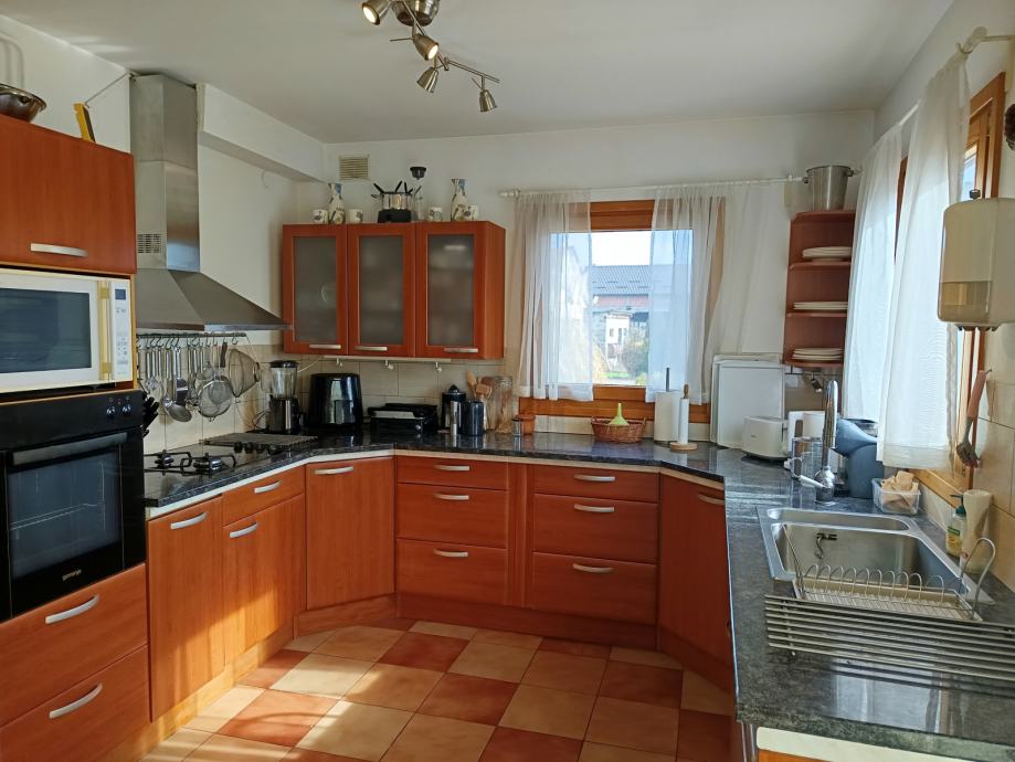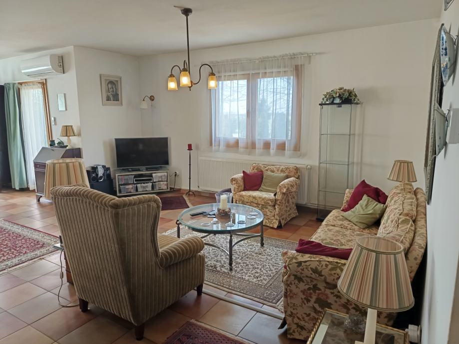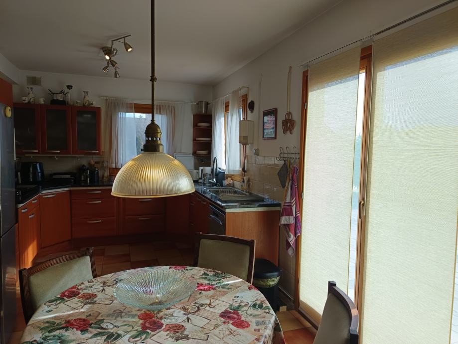 Nekretninu krase 4 prostrane spavaće sobe, po želji uredi, jedna s vlastitom en suite kupaonicom s wc-om. Velika obiteljska kupaonica potpuno opremljena. Open-space prostor s dnevnim boravkom, blagavaonom i po želji zatvorenom/otvorenom kuhinjom. Kuhinja visoke kvalitete, potpuno opremljena za moderan život, s izlaskom na predivnu opločenu terasu južne orijentacije. Pod cijele unutrašnjosti u keramici, u istom nivou, sa sustavom električnog podnog grijanja. Osim podnog grijanja, provedeno centralno grijanje na plin putem radijatora. Osim plina, kuća raspolaže i inverter klima uređajem visoke kvalitete, koji s obzirom na visoki energetski razred grije/hladi cijelu kuću. Na kraju, za predivan zimski ugođaj, tu je i kvalitetan i održavan Plamen kamin.