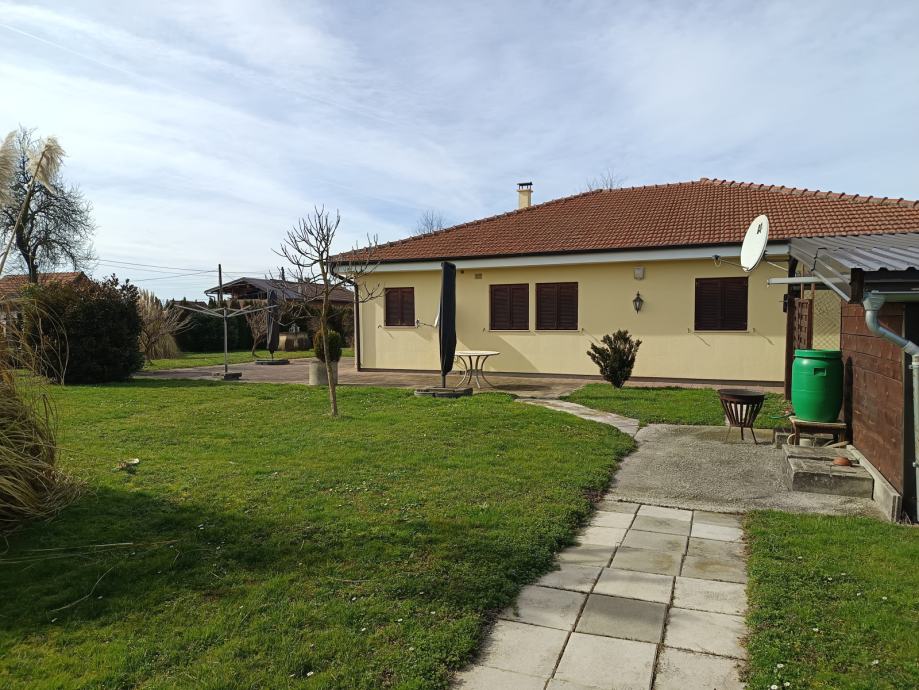 Betonirani prilaz i nadstrešnica za auto, 2 odvojene alatnice pod ključem, spremište za drva, plato pripremljen za bazen, predivan održavan park s ukrasnim biljem.