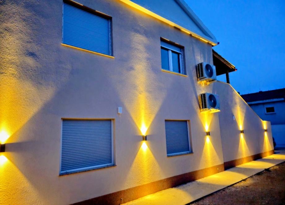 Kuća je etažirana i sastoji se od dva odvojena stana, svaki s vlastitim ulazom i velikim terasama.