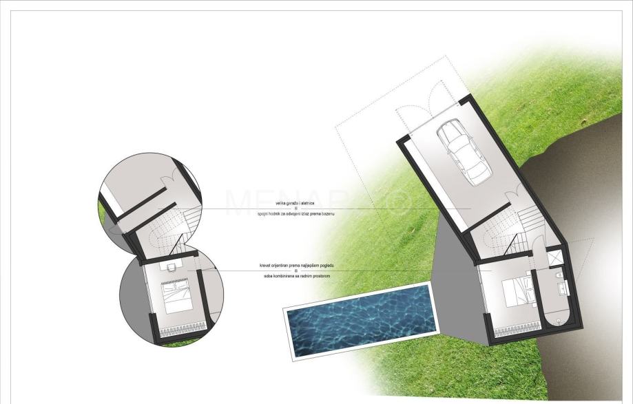 Kuća zahtijeva renovaciju, a uz nju je izrađeno idejno rješenje rekonstrukcije, čije su vizualizacije dostupne u oglasu.