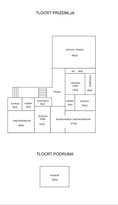 Prva stambena jedinica sastoji se od hodnika 5 m2, kuhinje 6 m2, kupaonice 5 m2, spavaće sobe 13 m2 i dnevnog boravka 19 m2 i čine ukupnu cjelinu od 48 m2. Obje stambene jedinice spojene su natkrivenim trijemom koji se nastavlja na ostavu i terasu veličine 44 m2.