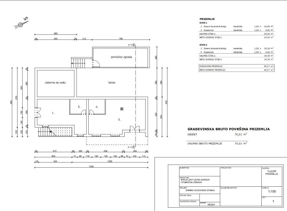 U prizemlju se nalazi neuređeni stambeni prostor veličine 60 m2 koje se može urediti u dva apartmana/mala stana, jedan veliki stan ili prostor za zabavu i druženje kao nadopuna gornjem stanu u smislu turističkog iznajmljivanja. Instalacije struje, vode, odvodnje i centralnog grijanja su već pripremljene za spajanje u prizemlju.