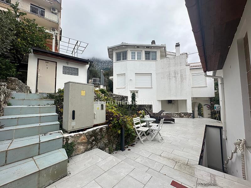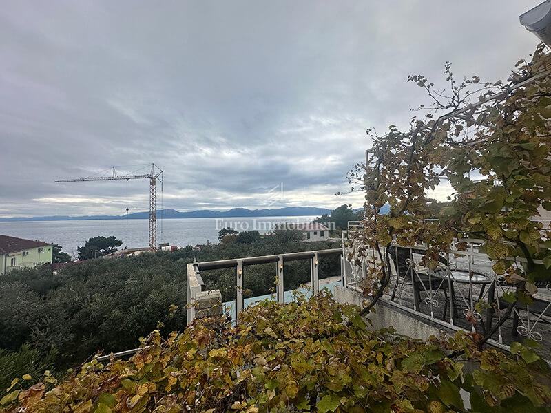 Na atraktivnoj lokaciji ispod Jadranske magistrale, svega minutu hoda od glavne plaže, nalazi se kvalitetna, samostojeća i arhitektonski jedinstvena obiteljska kuća s panoramskim pogledom na more. Ukupna površina kuće s pripadajućim objektima iznosi 278 m².