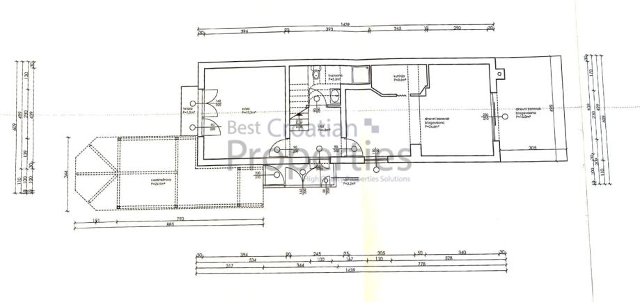 Dvojni objekt prostire se na oko 400 m2 površine, s pripadajučim poslovnim prostorom u suterenu.