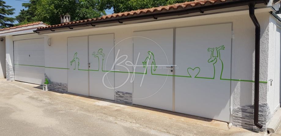 Na prostranoj okućnici od 860 m2 nalaze se tri garaže i veliko skladište te je moguće postaviti bazen koji će imati također pogled na more.