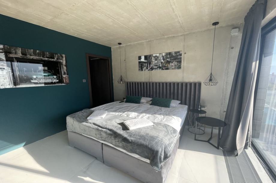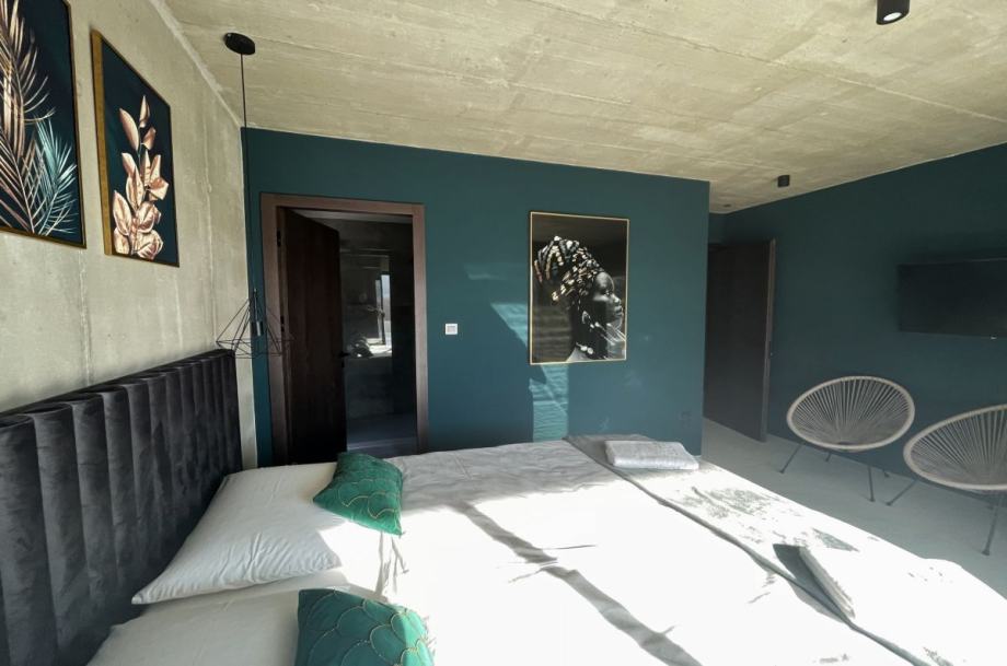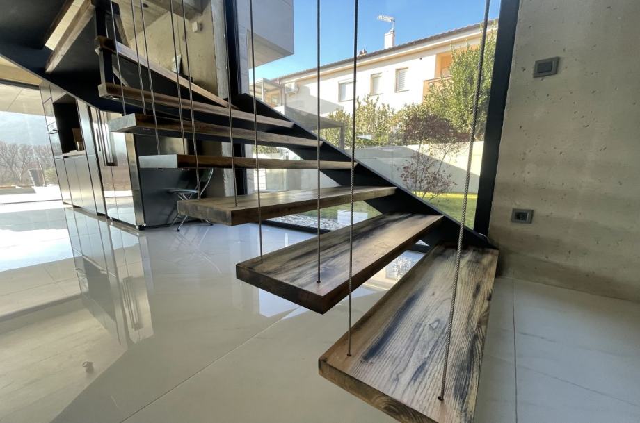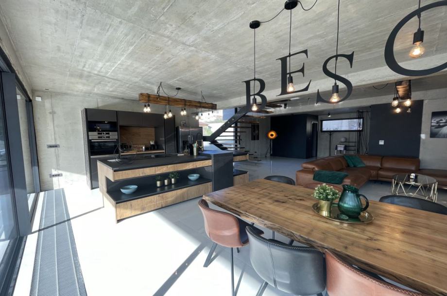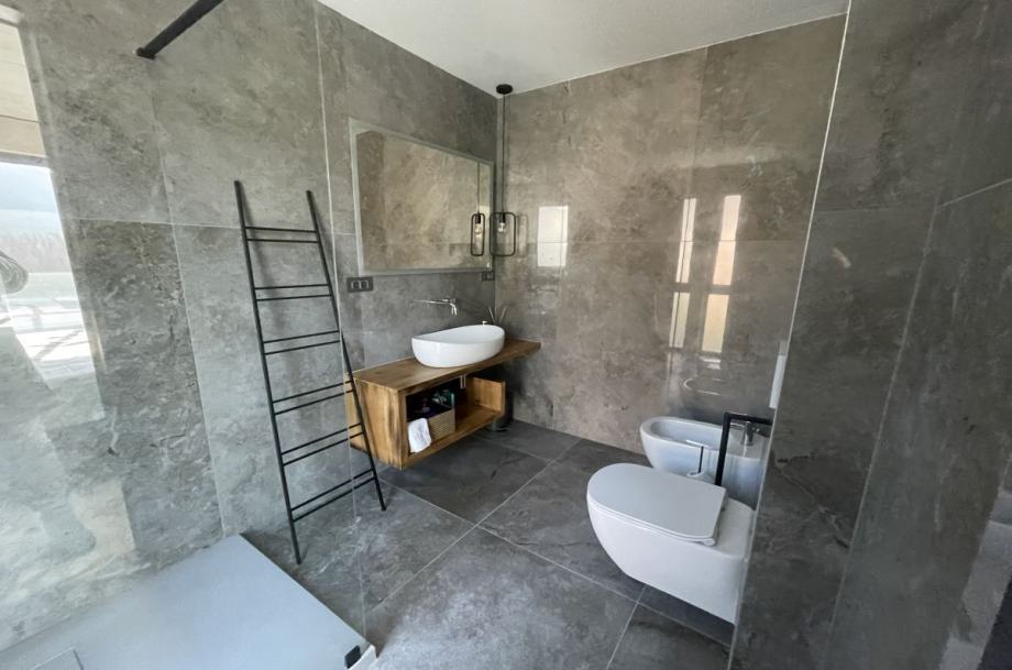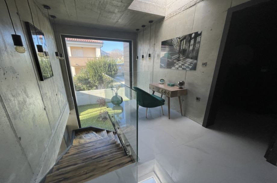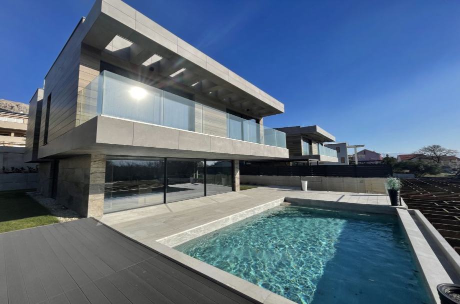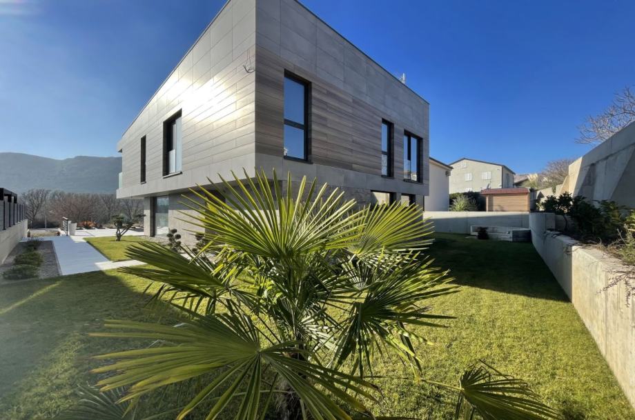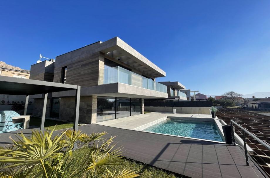 Otok Krk, Baška, prodaja ekskluzivne, dizajnerske, urbane vile, površine 249,79 m2, s bazenom i uređenom okućnicom, na parceli površine 630 m2. Vila se sastoji od suterena s igraonicom, wellnessom ( finska sauna, jacuzzi, tuš ), teretanom, kotlovnicom, strojarnicom bazena, spremištem, stubištem te praonicom rublja, prizemlja s predprostorom, dnevnom sobom, kuhinjom, blagovaonom, toaletom, stubištem, prostranom natkrivenom terasom, sunčalištem, bazenom i vanjskom natkrivenom kuhinjom s plinskim roštiljem i prostorom za druženje te prvog kata s četiri spavaće sobe s vlastitim kupaonicama, hodnikom, te balkonom površine 14,70 m2. Vrhunska kvaliteta gradnje i opreme, dizajnerski namještaj, klimatizacija, staklene stijene s niskoprofilnim okvirima, podno grijanje i hlađenje pomoću dizalica topline i fan-coilera u dnevnoj te spavaćim sobama, zasebna regulacija grijanja i hlađenja svih prostorija, preljevni bazen s vrhunskom bazenskom tehnikom, protustrujnim plivanjem, masažnim mlaznicama i automatskim čišćenjem filtera, vrhunska unutarnja i fasadna keramika proizvođača IMOLA, automatsko navodnjavanje okućnice, toplinski izolirana ventilirana fasada otporna na klimatske utjecaje, solarni sustav za grijanje sanitarne vode, četiri natkrivena parkirna mjesta. Atraktivna lokacija 500 m od plaže i centra.