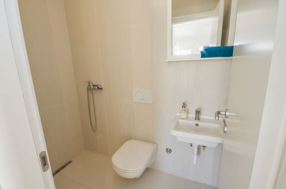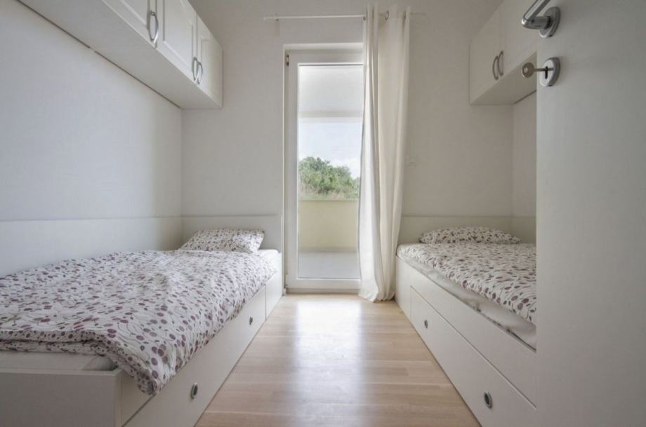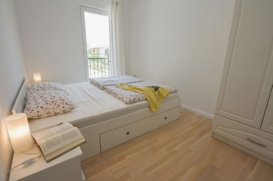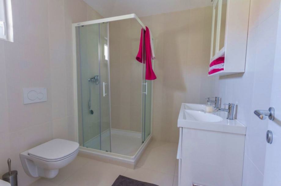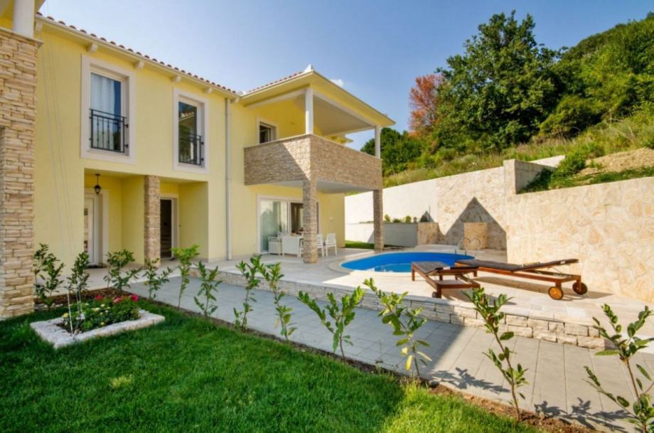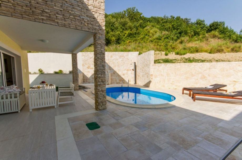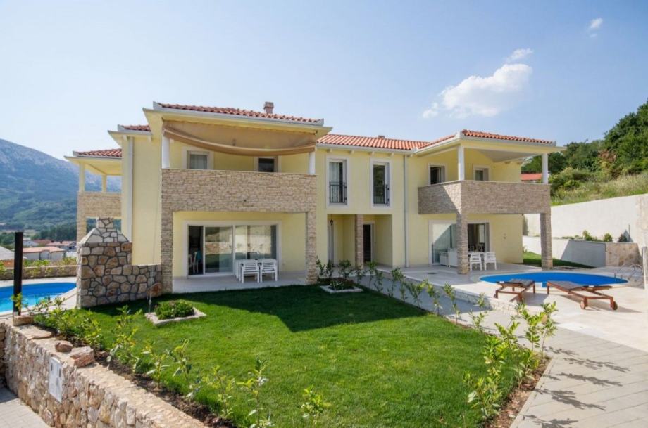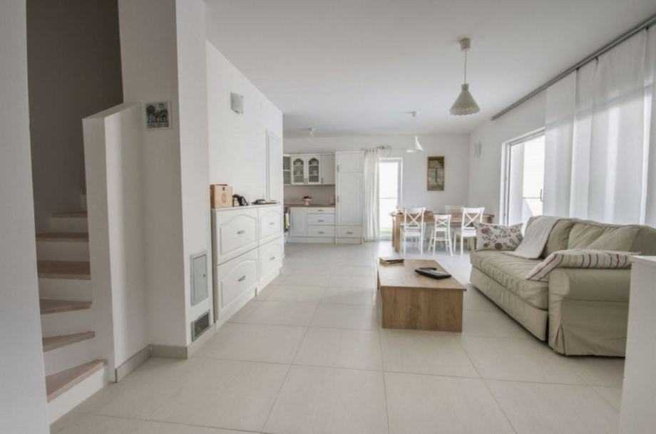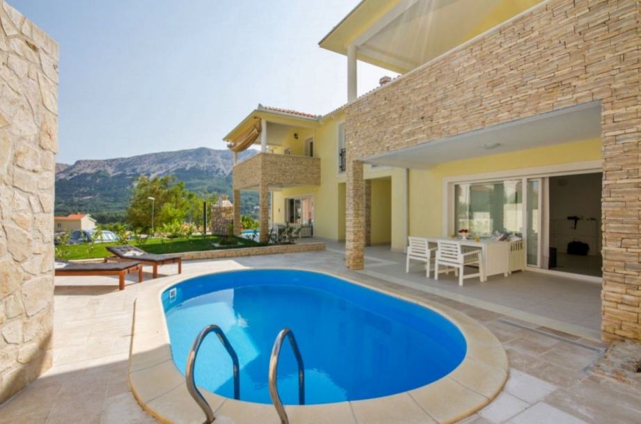Otok Krk, Baška, šire područje, prodaja atraktivne dvojne kuće površine 98,63 m2, s bazenom i uređenom okućnicom površine 170 m2, na mirnoj lokaciji, 1000 m od plaže. Kuća se sastoji od prizemlja s dnevnom sobom, kuhinjom, blagovaonom, toaletom, ostavom, hodnikom i terasom te prvog kata s tri spavaće sobe, dvije kupaonice i dvije terase. Kvalitetna gradnja i oprema, PVC stolarija, klimatizacija, podno grijanje, dva parkirna mjesta.