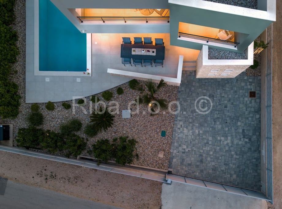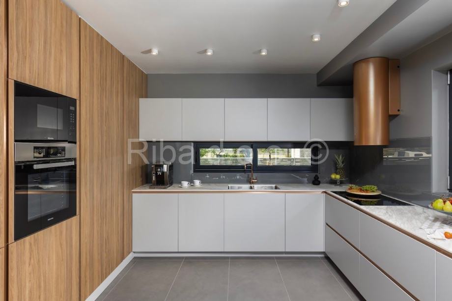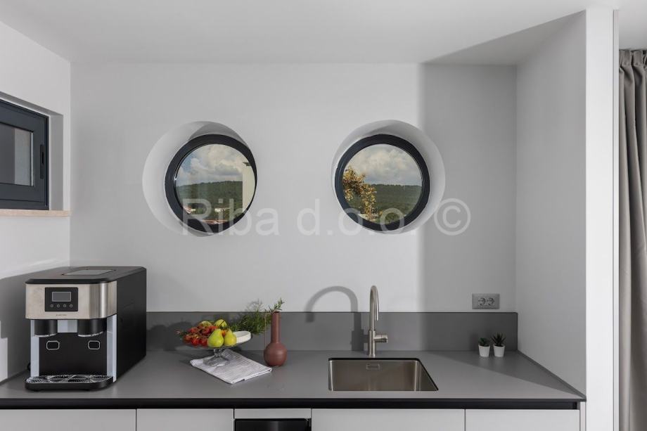 U prizemlju su garderoba, dnevni boravak, kuhinja, blagovaonica, kupaonica i toalet. Iz dnevnog boravka se izlazi na bazen i sunčalište, te ljetnu kuhinju i roštilj. S druge strane je sauna.