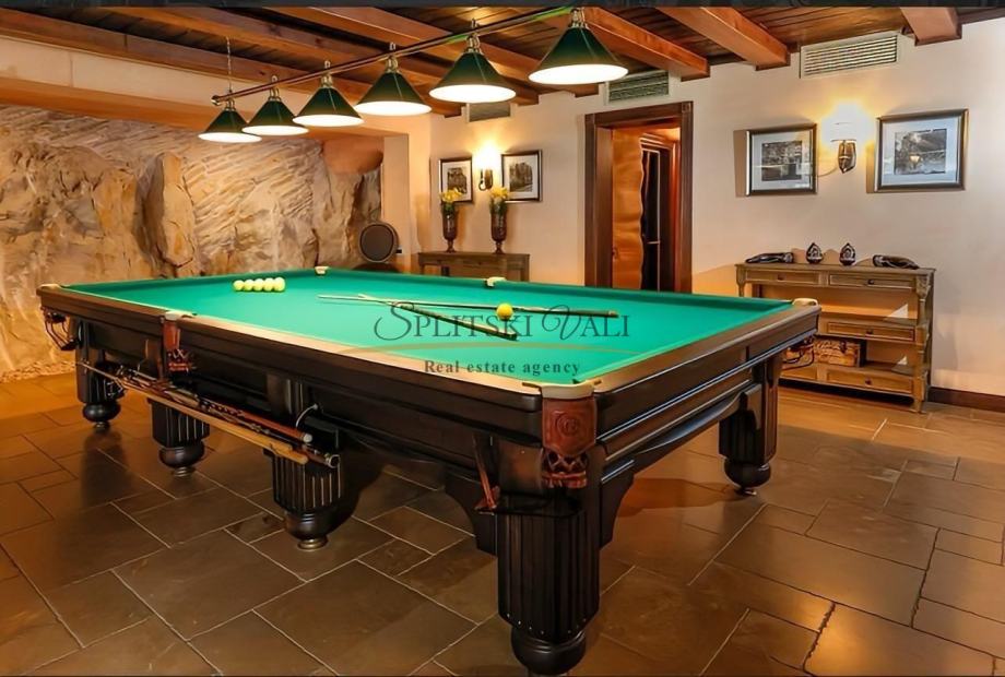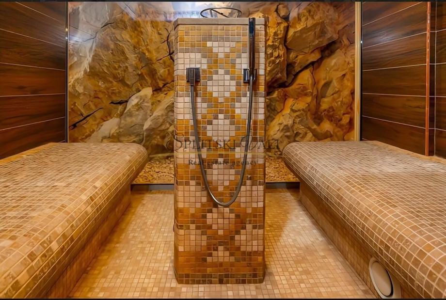 Ova posebna nekretnina izgrađena je od bračkog kamena i proteže se na ukupno tri kata. U prizemlju se nalazi praonica, vinski podrum i garderoba. Također, na prizemlju se nalazi spavaća soba s kupaonicom i terasom, kuhinja s blagovaonicom i dnevnim boravkom, kao i spa zona s manjim unutarnjim bazenom i ruskom saunom.
